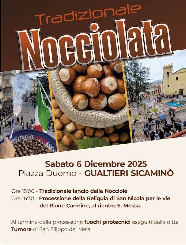 La festa di San Nicola a Gualtieri Sicaminò comincia qualche giorno prima con le novene, durante le quali oltre alle preghiere si inneggiano canti e lodi che si tramandano di padre in figlio, e procedono nelle giornate del 3, 4 e 5 dicembre con la raccolta delle offerte. Gruppi di gualteriesi si recano in giro per le case, intonando l’inno Viva Viva Santa Nicola, bussano alle porte dei residenti che offrono in dono fichi secchi, noci, nocciole ecc. tutti frutti legati alla Grande Madre Terra, simboli di fertilità e di abbondanza. Il vescovo di Myra, con la sua bisaccia carica di doni, è divenuto il simbolo stesso della prosperità e dell’abbondanza. A Gualtieri Sicaminò le celebrazioni in onore del Santo patrono culminano con la tradizionale Nocciolata di San Nicola durante la quale, dai balconi delle case che si affacciano in Piazza Duomo, vengono gettate sulla folla oltre mille chili di nocciole.