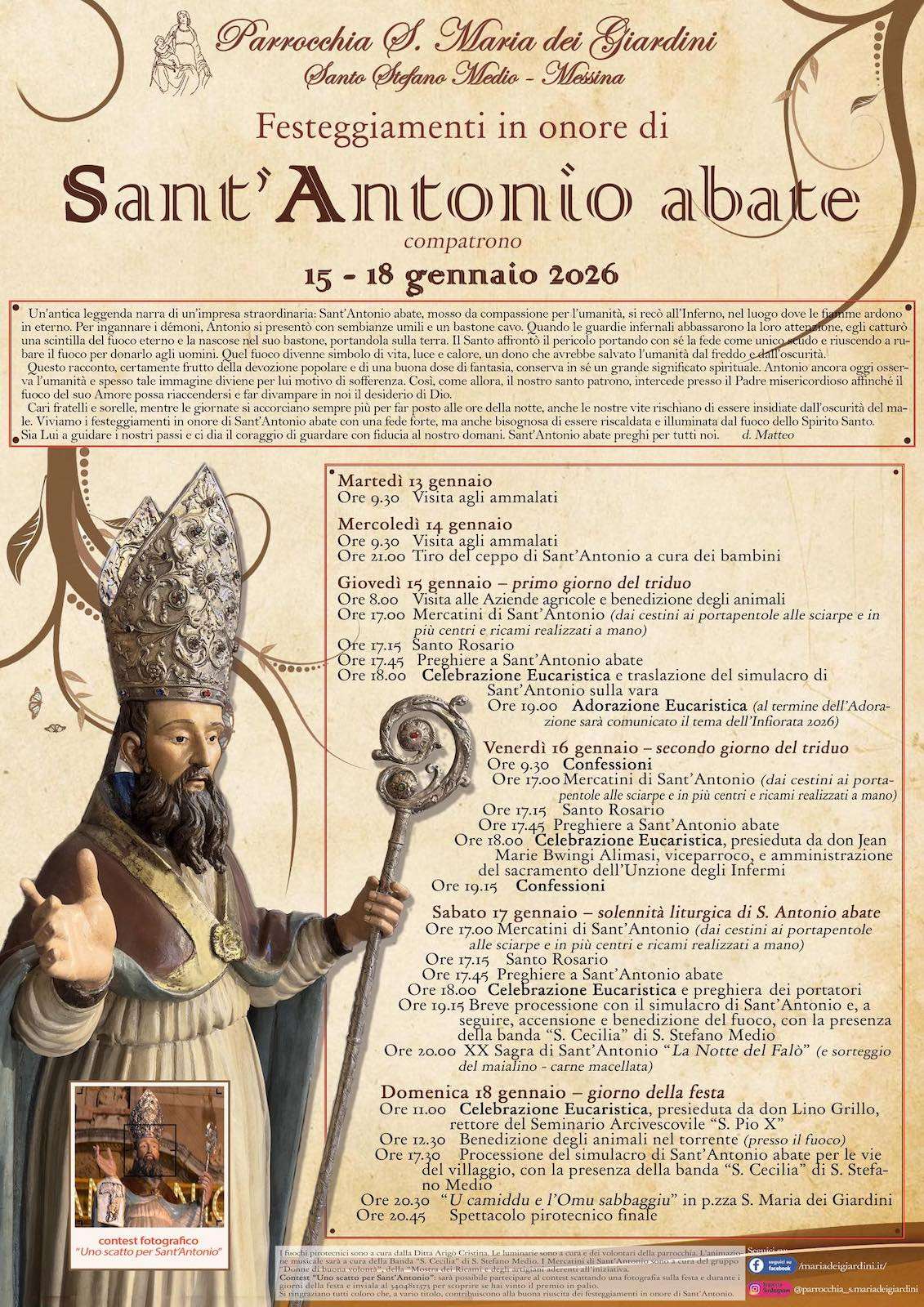 La Festa di Sant’Antonio Abate di Santo Stefano Medio di Messina con la benedizione degli animali nel torrente, l’accensione del grande falò, la sagra di Sant’Antonio, la solenne processione e la pantomima che rievoca lo sbarco dei Normanni in Sicilia.