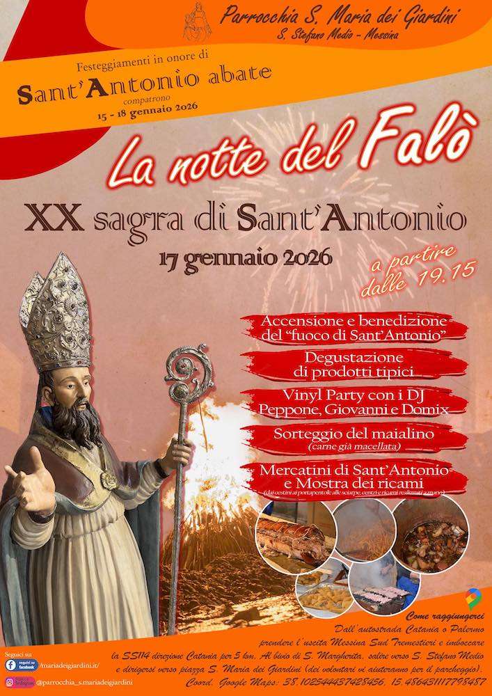 A Santo Stefano Medio nel mese di gennaio si celebra Sant’Antonio Abate con una festa molto particolare che richiama devoti e curiosi anche dalle località vicine. Il villaggio, che prende il nome da un abate basiliano, è una frazione di Messina, sorge alle pendici dei Peloritani e ha origini antiche, risalenti al Medioevo. La domenica successiva al 17 gennaio, giorno della festa liturgica di Sant’Antonio Abate patrono del bestiame, la piccola comunità si stringe attorno al suo compatrono, dedicandogli una festa che rappresenta un connubio tra religiosità e folklore. Il Santo viene celebrato con l’accensione di un grande falò la sera della vigilia della festa, nei pressi del torrente che attraversa il villaggio, e con una breve processione del simulacro. Al termine ha luogo la tradizionale Sagra di Sant’Antonio. E’ questa la Notte del Falò, occasione per gustare, tra balli e musica popolare, i tanti prodotti tipici del territorio e i gustosi maccaruni col sugo di maiale, frittuli e sosizza oltre a crespelle, crepes e dolci.