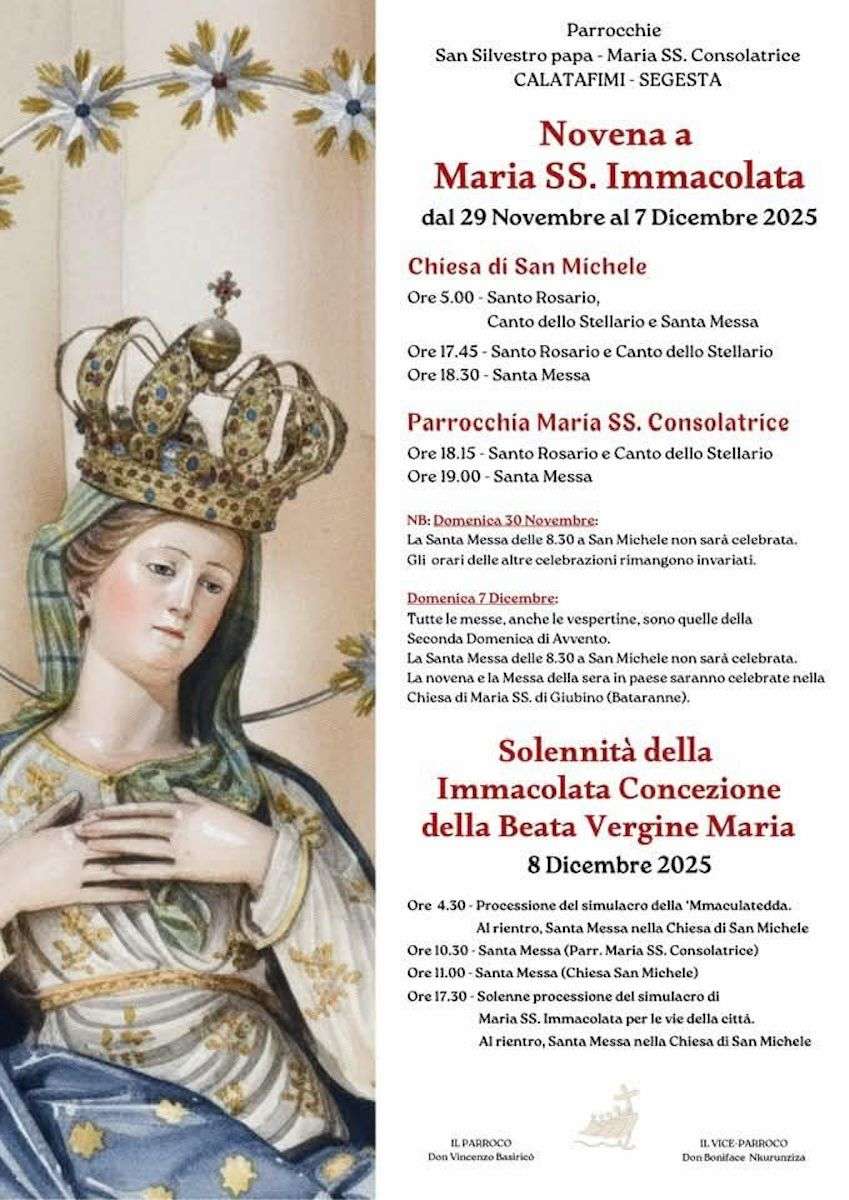 La Festa dell’Immacolata di Calatafimi Segesta prende il nome di “mmaculatedda” ed ha origini antiche. Si racconta infatti che risalga agli inizi del secolo scorso e si deve al calzolaio Vincenzo Avila che, per devozione alla Madonna, decise di far benedire al termine del novenario un’effigie in cartapesta della Vergine che teneva in casa. E così, all’alba dell’8 dicembre del 1908, prima che iniziassero le sacre funzioni, assieme ad altri compaesani si recò presso la Chiesa di San Michele, portando con sé la statua. Quell’avvenimento negli anni a seguire si ripeté più volte e coinvolse l’intera comunità, tant’è che nel tempo i devoti che si unirono alla suggestiva processione aumentarono. Il simulacro veniva portato per le vie del paese con delle fiaccole, realizzate con gambi di ampelodesma, utilizzate per illuminare il tragitto, poiché all’epoca l’assenza di corrente elettrica e le strade dissestate, rendevano difficoltoso il cammino. Ed oggi come allora la processione della mmaculatedda si svolge con le stesse caratteristiche e con le tradizionali invocazioni alla Madonna.