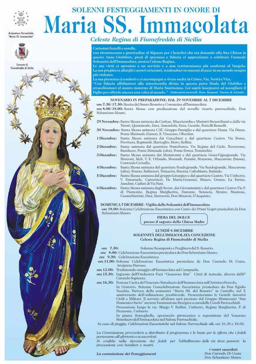 La Festa della Madonna Immacolata di Fiumefreddo di Sicilia dell’ultima domenica di luglio, nella ricorrenza della dedicazione della Chiesa Madre. La devozione alla Madonna Immacolata e il miracolo del ritrovamento dell’acqua. Le celebrazioni religiose del giorno di festa e la solennità dell’8 dicembre. Fiera del Dolce.