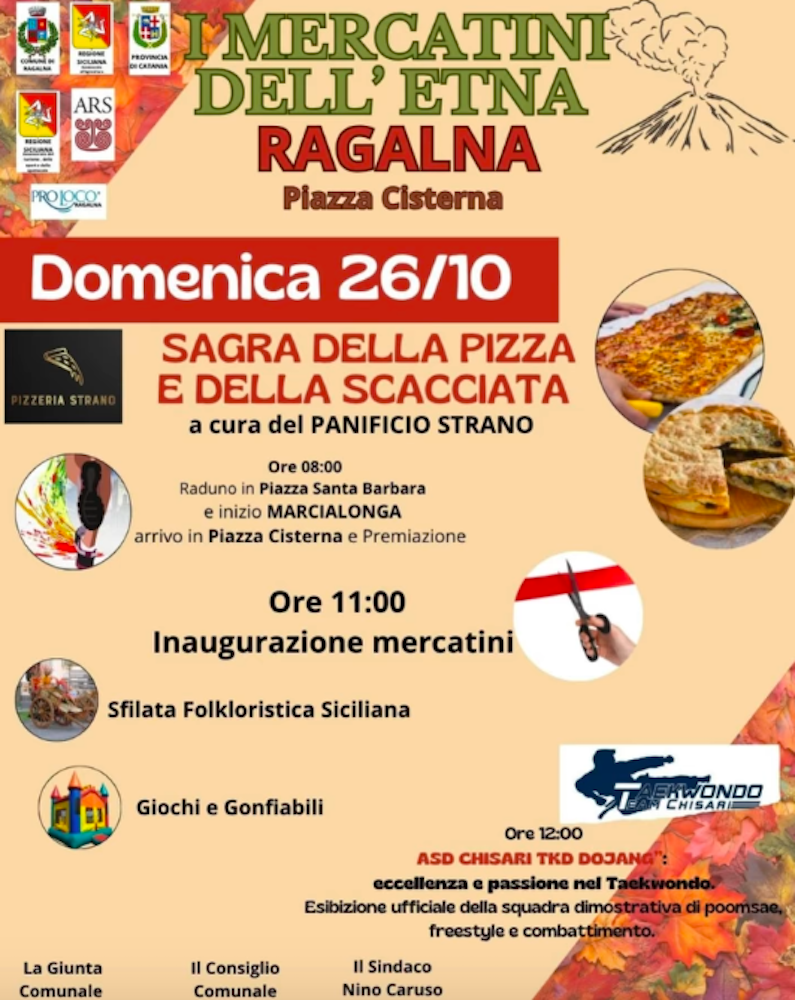 A Ragalna l’Autunno ha qualcosa di speciale. La cittadina catanese, immersa nel verde del Parco dell’Etna, le domeniche di Autunno mette in piazza le eccellenze del territorio nei numerosi eventi tematici. Le domeniche saranno dedicate ai sapori dell’autunno ragalnese e i produttori locali esporranno le prelibatezze del territorio etneo quali formaggi, ricotta, olio, funghi, verdure spontanee, vino e quant’altro. Non mancheranno gli stand con i manufatti di artigianato e le specialità gastronomiche locali preparate secondo le ricette tradizionali. Ogni domenica sarà proposto un menù diverso, per recuperare e valorizzare i piatti tipici locali.