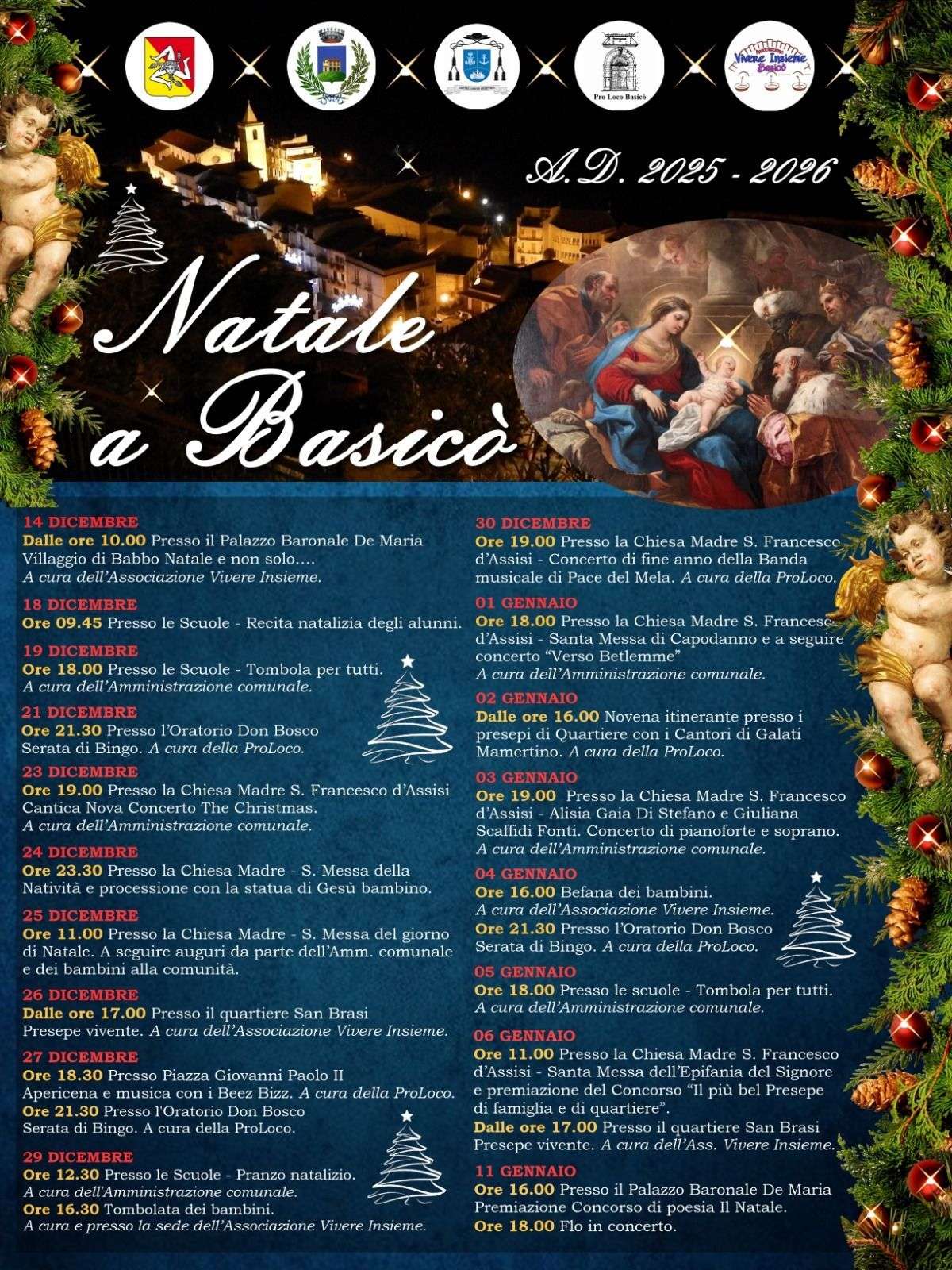 Durante il periodo natalizio, Basicò si veste di magia e tradizione. Nel quartiere San Brasi prende vita il suggestivo Presepe Vivente, con la rappresentazione degli antichi mestieri e la possibilità di degustare i prodotti tipici del territorio. Il 24 dicembre si tiene la toccante processione con Gesù Bambino tra fede e commozione. Le festività sono rese ancora più speciali da tombolate, concerti natalizi, spettacoli musicali e dai canti della tradizione accompagnati dal suono incantevole delle cornamuse.