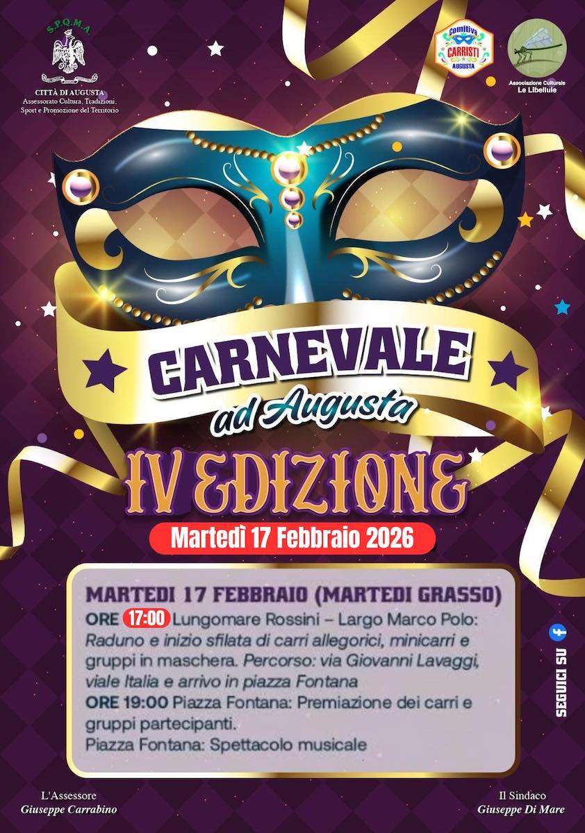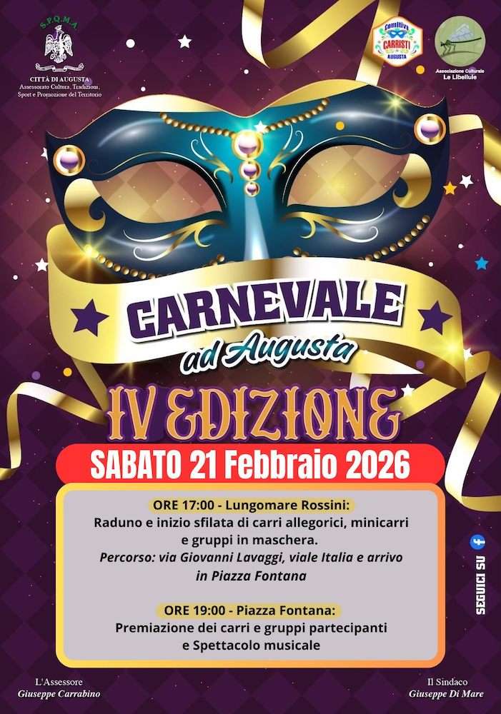 Il Carnevale 2026 di Augusta è in programma dal 13 al 17 febbraio.