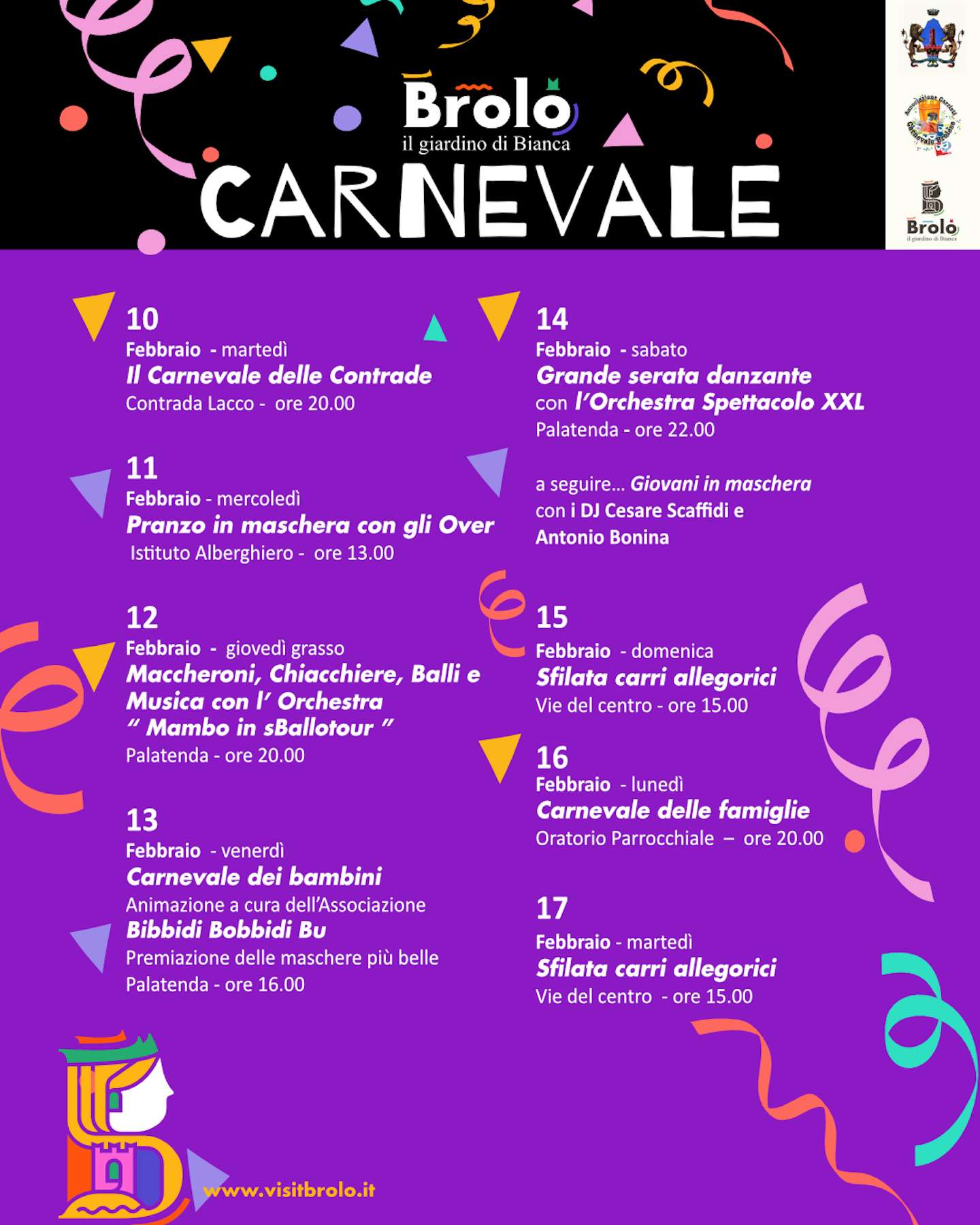 Il programma del Carnevale Brolese che coinvolgerà grandi e piccini è curato dall’associazione carristi di Brolo con il patrocinio dell’amministrazione comunale.