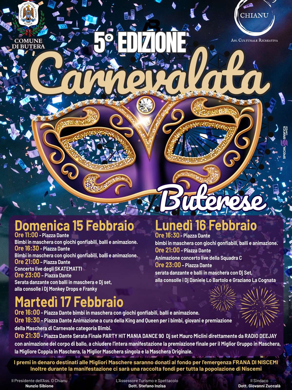Un elemento caratteristico del Carnevale buterese è il concorso che premia le maschere più belle e originali. Questo concorso non è solo una competizione, ma anche una celebrazione della creatività e dell’immaginazione. Al Carnevale di Butera vengono premiati il miglior gruppo in maschera, la migliore coppia in maschera, la maschera più originale e la migliore maschera singola, valorizzando la creatività e stimolando la partecipazione entusiasta di tutti i concorrenti. Quest’anno, i premi assegnati alle migliori maschere saranno devoluti al fondo per l’emergenza frana di Niscemi e, nel corso della manifestazione, sarà organizzata anche una raccolta fondi solidale a sostegno della popolazione di Niscemi, trasformando la festa in un momento di condivisione e concreta solidarietà.