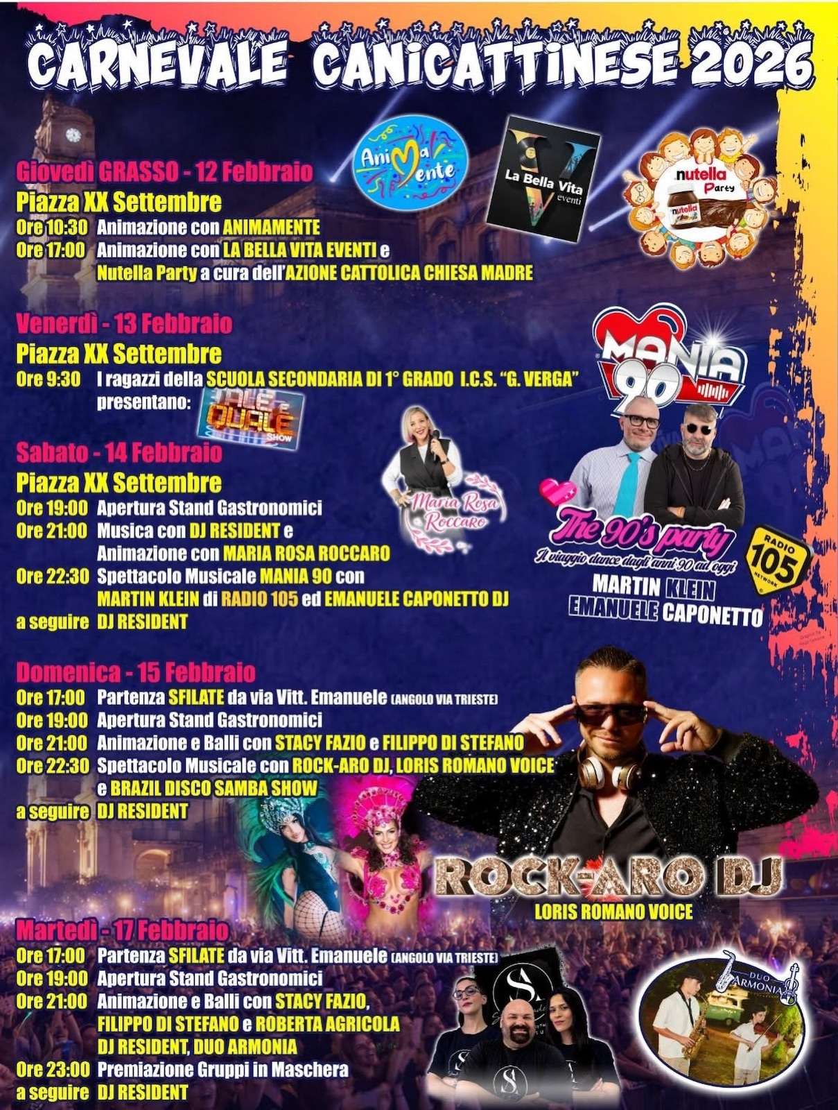 Il Carnevale 2026 di Canicattini Bagni è in programma dal 12 al 17 febbraio.