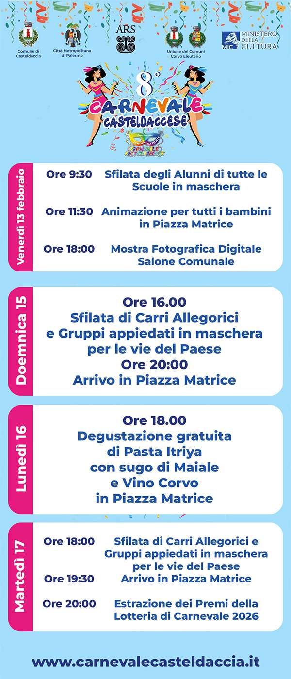 Il Carnevale è ufficialmente alle porte e, come risaputo, è la festa tanto attesa e amata soprattutto dai più piccoli. A Casteldaccia il Venerdì sarà interamente dedicato ai bambini con la sfilata in maschera degli alunni delle scuole e l’animazione in piazza. Al carnevale casteldaccese non mancheranno le degustazioni delle specialità culinarie della tradizione carnascialesca, come la pasta con il sugo di maiale.
