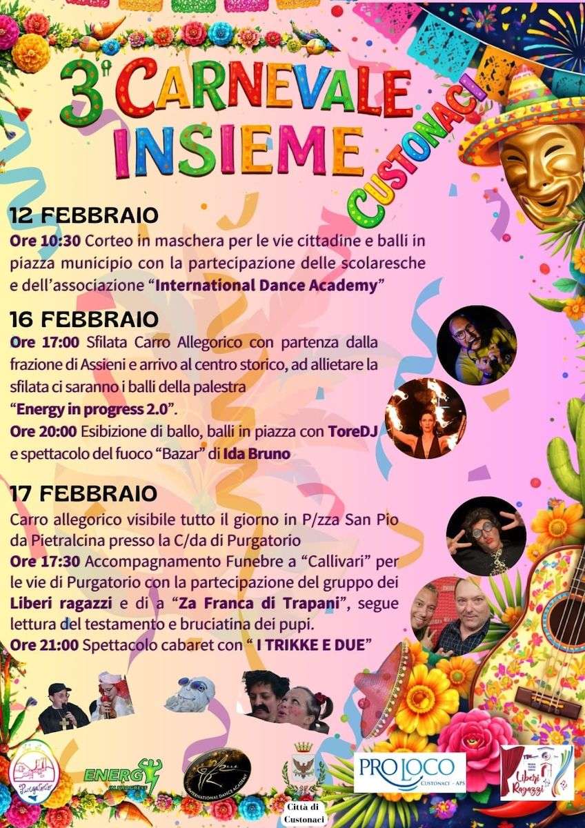 Ogni anno, i festeggiamenti di Carnevale a Custonaci sono un’esplosione di gioia: sfilate, danze, colori, musica e allegria animano le strade, portando con sé la bellezza di una tradizione che resiste nel tempo. La comunità di Custonaci, con il suo spirito di condivisione e la passione per la propria cultura, rende il Carnevale un’occasione speciale per tutti, dai più piccoli ai più grandi. Ogni pupo di paglia e ogni maschera racchiudono un racconto, trasformando ogni festa in un momento speciale da vivere e ricordare insieme. A Custonaci, il Carnevale è un’esperienza unica da vivere in compagnia, dove la risata è contagiosa e il cuore batte forte al ritmo della tradizione. La magia della festa si rinnova ogni anno, ma la bellezza di stare insieme, tra i colori dei coriandoli e l’energia della comunità, è qualcosa che resta nel cuore di tutti.