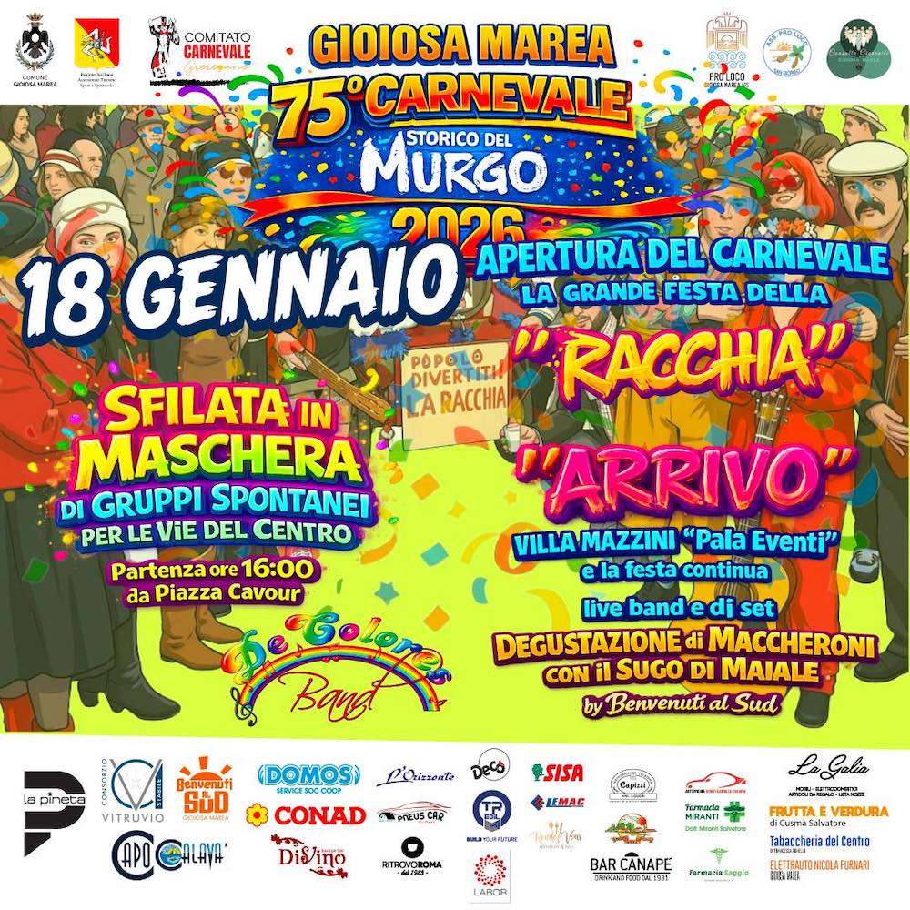 Il Carnevale del Murgo di Gioiosa Marea animerà le vie del centro già nelle giornate che precedono la domenica di Carnevale. A dare ufficialmente il via ai festeggiamenti sarà come da tradizione la Racchia, che si esibirà domenica 18 gennaio 2026 con le maschere e i musicanti allo sbaraglio. Si tratta di un gruppo spontaneo che sfila con costumi bizzarri e strumenti stravaganti, di cui fanno parte diverse racchie che, con la loro allegria coinvolgono grandi e piccini. I festeggiamenti proseguono nei giorni successivi con la sfilata delle murghe di quartiere che, ballando lungo le vie, raggiungeranno Piazzetta della Murga, dove si svolgerà la festa del Murgo con la degustazione dei prodotti enogastronomici a lui dedicati. Nei giorni del Carnevale del Murgo di Gioiosa Marea non mancheranno le sfilate di carri e di gruppi mascherati, che coinvolgeranno anche la frazione di San Giorgio, le serate danzanti, la degustazione di chiacchiere e tanti altri eventi all’insegna dell’allegria per grandi e piccini.