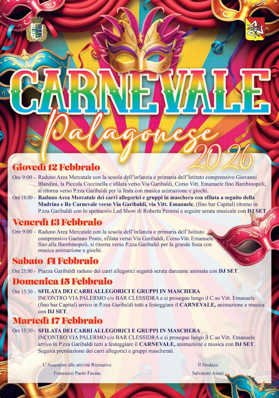 Arriva il Carnevale e puntuale Palagonia, la città in provincia di Catania celebre per la produzione e coltivazione di arance rosse, si prepara a accogliere i costumi, i colori e l’allegria di una delle feste più attese in particolar modo dai bambini ma capace di trascinare anche gli adulti. Nei giorni di Carnevale per il corso principale della città delle arance torneranno a sfilare i carri allegorici e i gruppi in maschera con i loro costumi variopinti. Il Carnevale è una festa amatissima dai bambini, una festa all’insegna dell’entusiasmo, della spensieratezza e del sano divertimento. Nei giorni più divertenti dell’anno a Palagonia non potevano mancare gli eventi e gli spettacoli pensati per i più piccoli. Saranno proprio gli alunni delle scuole a dare inizio ai festeggiamenti con la sfilata delle mascherine tra musica, premi e divertimento. La Domenica di Carnevale e il Martedì Grasso lungo la via centrale del centro di Palagonia sfileranno i carri allegorici accompagnati dalle esibizioni dei gruppi mascherati che riempiranno la città con i loro colori e la loro allegria. La festa si concluderà in serata con gli spettacoli musicali in piazza e la premiazione finale.
