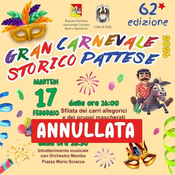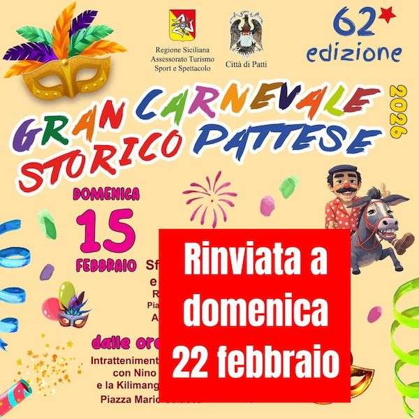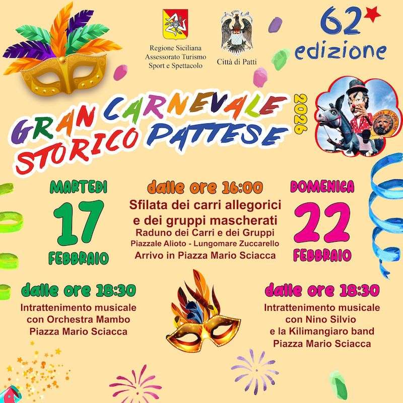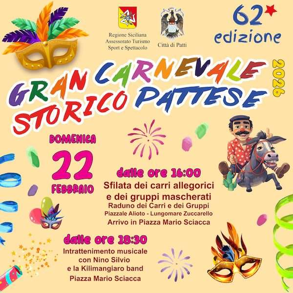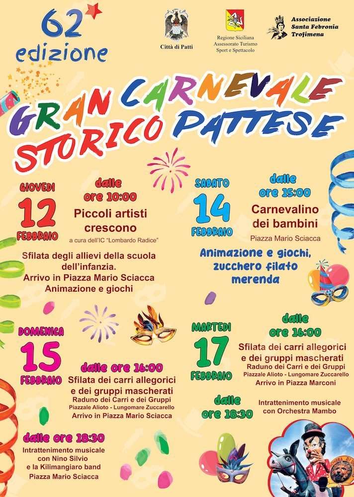 Il Gran Carnevale Pattese scende in strada già nella giornata di venerdì grasso, con la sfilata serale dei carri allegorici che partiranno dal lungomare di Patti Marina con arrivo in Piazza Marconi. Le opere di cartapesta si muoveranno lungo il percorso storico, accompagnati da gruppi in maschera e da tanta gente in festa. Non mancherà inoltre il tradizionale appuntamento con il carnevalino dei bambini, con intrattenimento, giochi e merende, e il simbolo del Carnevale pattese, ossia la maschera di “don Liu u siminsazu”, un personaggio molto amato dalla popolazione locale. La sera invece si aprono le danze con le melodie dei gruppi musicali.