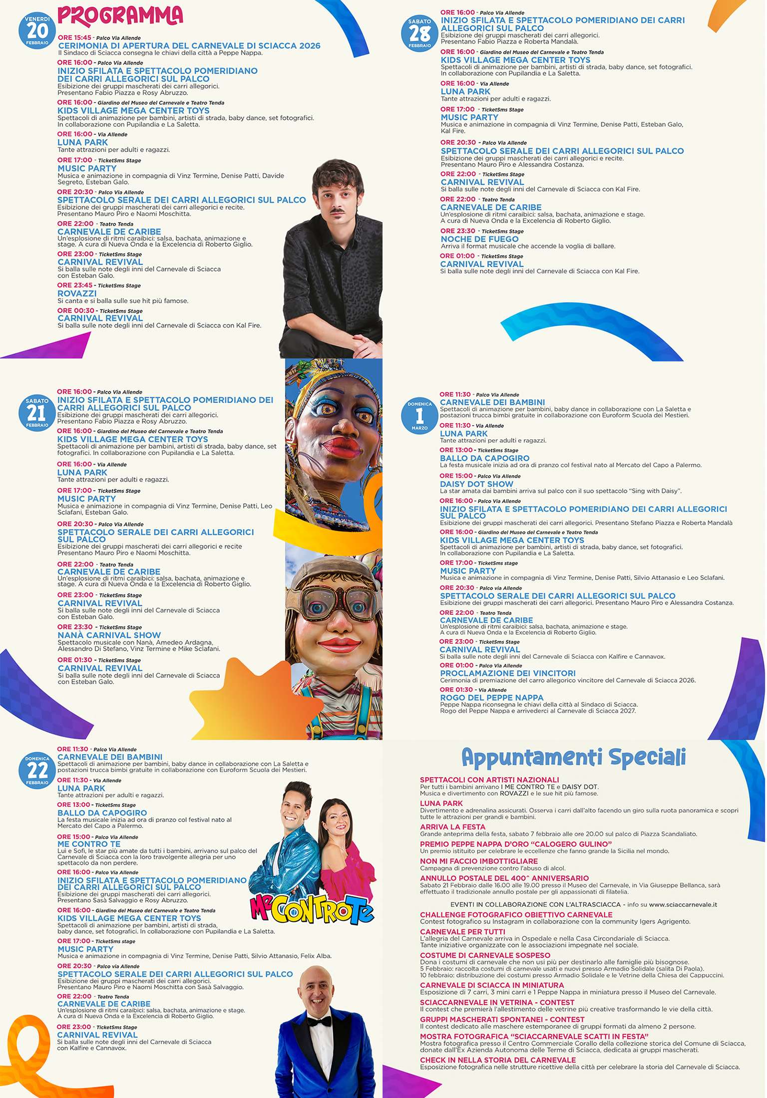 Il Carnevale 2026 di Sciacca è stato rinviato di una settimana ed è in programma dal 20 febbraio al 1° marzo.