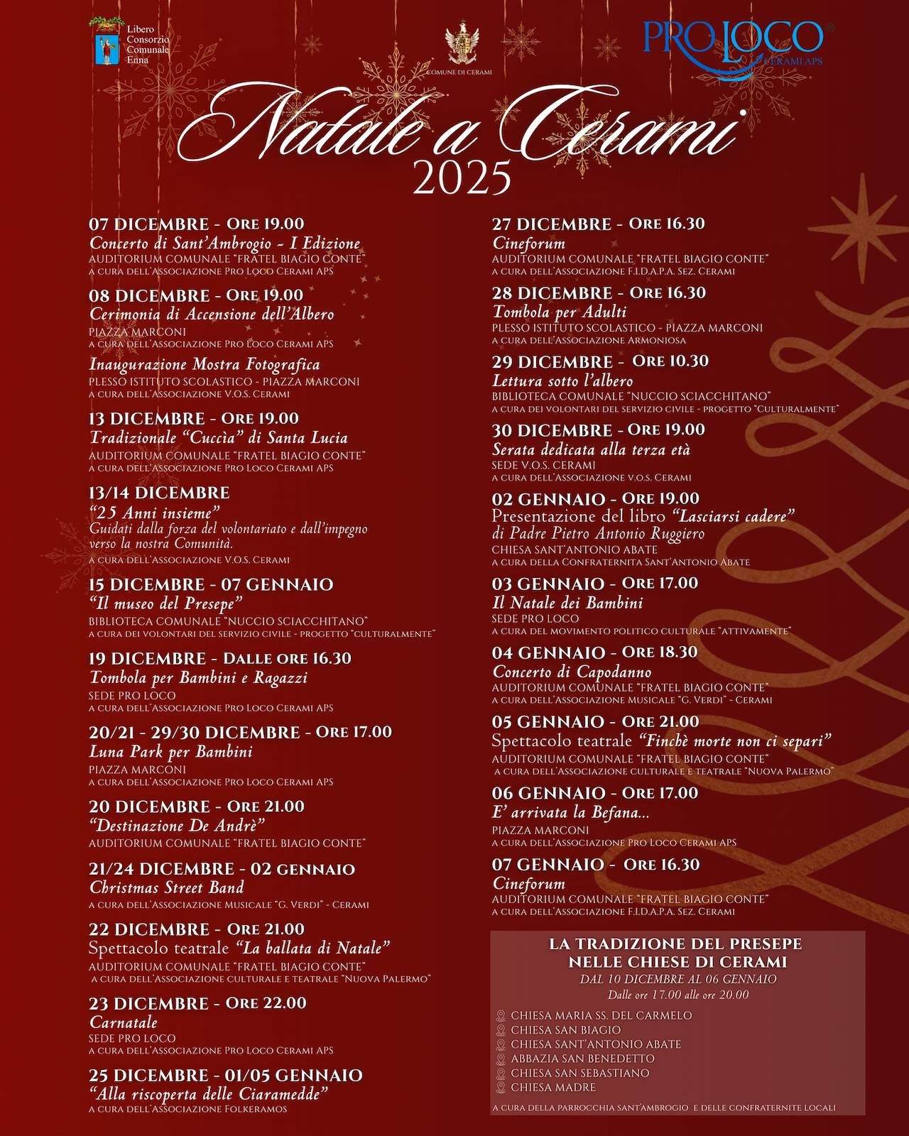 La Festa di Sant’Ambrogio, Patrono di Cerami, si celebra il 7 dicembre con una messa solenne molto partecipata, alla quale prendono parte numerosi fedeli, le Confraternite e le autorità civili e religiose.