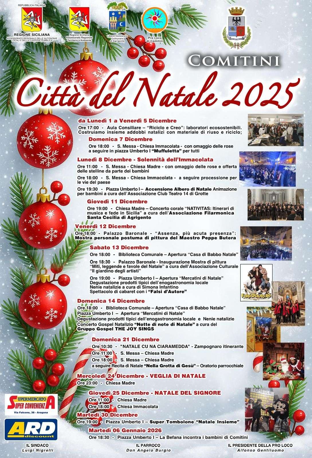 Nei giorni di Natale Comitini si anima con un ricco programma di eventi che unisce tradizione e divertimento. Per le vie del paese risuonano le melodie degli zampognari, mentre il Villaggio di Babbo Natale incanta grandi e piccini con la sua atmosfera magica. In piazza si svolge la tradizionale tombolata e la gustosa Sagra della Miscata Comitinese, occasione perfetta per assaporare questa specialità tipica insieme ad altri prodotti locali, in un clima di festa e convivialità.
