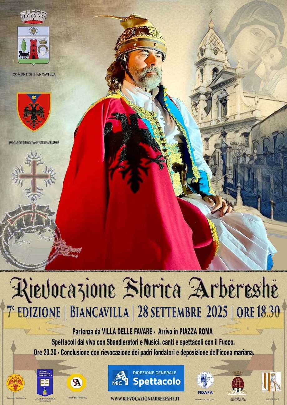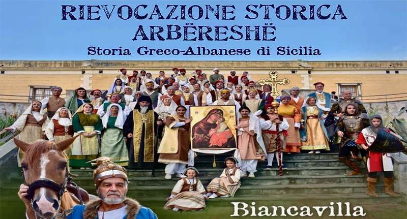 La Rievocazione Storica Arbëreshë di Biancavilla si svolge nei giorni di festeggiamenti patronali con il tradizionale corteo storico dei figuranti in costume d’epoca dedicato alla storia dei greco-albanesi di Sicilia, fondatori di Biancavilla. Correva l’anno 1482, quando una colonia di profughi guidata da Cesare De Masi proveniente dalla città di Scutari, in fuga dall’avanzata dell’esercito turco, sbarcò in Sicilia per raggiungere il capoluogo e da qui i conterranei che all’epoca popolavano Piana dei Greci, l’attuale Piana degli Albanesi. Ma durante il loro viaggio si fermarono in una zona allora chiamata Callicari o Poggio Rosso, dei Conti Moncada di Adernò, per trascorrere la notte. Si racconta che portavano con sé l’icona bizantina della Madonna dell’Elemosina, una reliquia del soldato martire Zenone ed una croce in legno e che appesero il quadro della Madre di Dio ad un albero di fico. Al loro risveglio scoprirono che i rami del fico erano cresciuti fino ad avviluppare l’icona, tant’è che non fu possibile districarla ed interpretarono l’accaduto come la volontà della Madonna di rimanere in quel luogo. In seguito a quell’avvenimento fu fondata Biancavilla dal conte Gian Tommaso Moncada, il quale chiese e ottenne la licentia populandi.