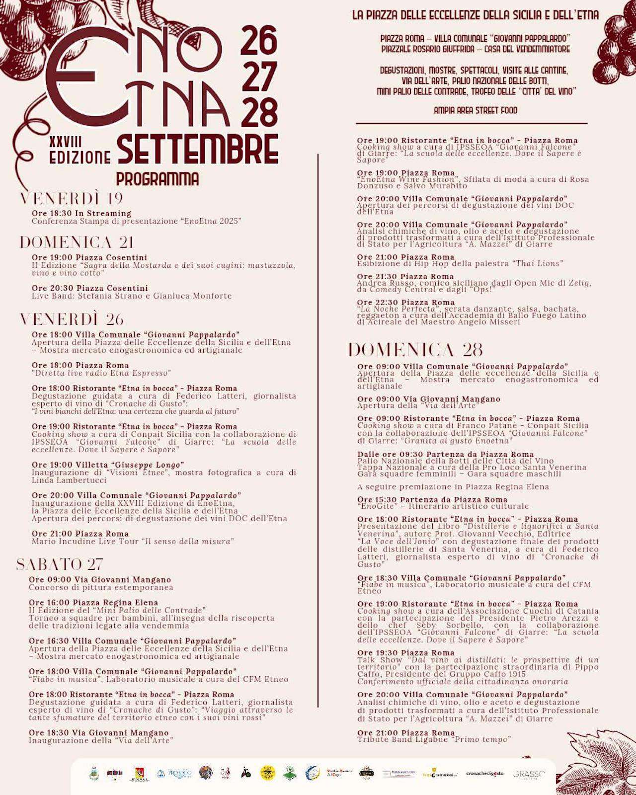 L’evento Eno Etna, che ha luogo a Santa Venerina, in provincia di Catania, è una straordinaria vetrina dei vini siciliani, una mostra-mercato dedicata ai prodotti tipici agroalimentari e all’artigianato locale. Questa manifestazione offre un’esperienza multisensoriale che comprende degustazioni, incontri culturali, conferenze e tanti spettacoli d’intrattenimento. Ma il vero protagonista di questa kermesse è sempre stato il vino.