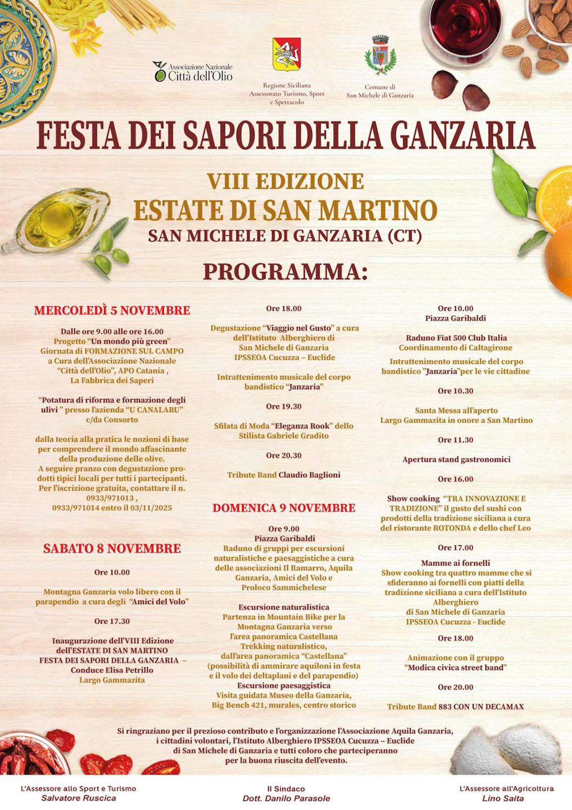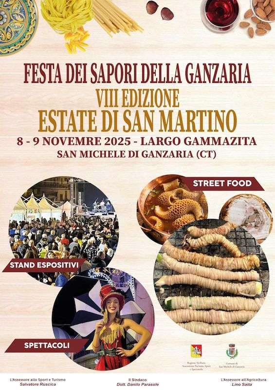L’Estate di San Martino della Ganzari è in programma l’8 e il 9 novembre. Presso Largo Gammazita saranno allestiti gli stand gastronomici dove poter acquistare i tanti prodotti tipici che caratterizzano il territorio di San Michele e gustare le specialità culinarie tradizionali preparate dalle associazioni locali e dagli studenti dell’Istituto Alberghiero di San Michele di Ganzaria. Saranno giorni alla riscoperta dei sapori di un tempo e all’insegna della storia e della tradizione.  Non mancheranno le visite guidate al Museo della Ganzaria per ammirare i suoi reperti archeologici, la sala degli antichi mestieri e i costumi tipici albanesi della tradizione Arbëreshë.