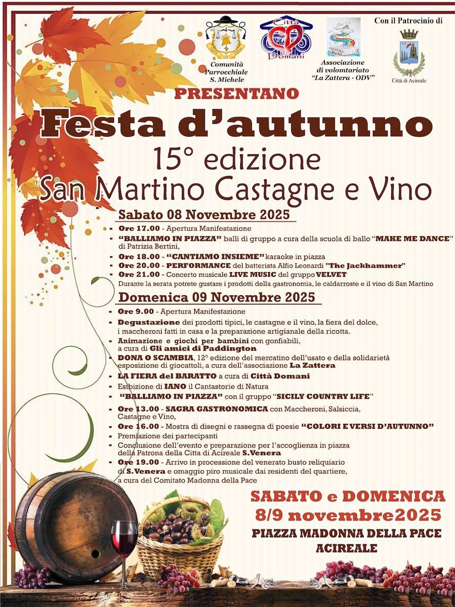 Acireale, una città dal ricco patrimonio culturale e gastronomico, per la Festa di San Martino si veste dei colori e profumi autunnali. La festa d’Autunno è organizzata dalle associazioni Città Domani e La Zattera e dalla Parrocchia di San Michele di Acireale e coinvolge il quartiere di San Michele, dove le vie si animano di stand enogastronomici e momenti di intrattenimento, rendendo l’atmosfera vivace e coinvolgente. La festa di Acireale inizia di buon mattino con la degustazione di prodotti tipici, dando ai partecipanti l’opportunità di assaporare le delizie autunnali. I più piccoli potranno divertirsi con varie animazioni pensate appositamente per loro, i giochi gonfiabili e il teatro delle marionette. Ma il vero cuore dell’evento batte in piazza, dove, alle 13 in punto, prende il via la Sagra gastronomica. Qui, i visitatori possono deliziarsi con i maccheroni fatti in casa, gustare la saporita salsiccia, le profumate castagne e, naturalmente, il vino, senza dimenticare i dolci e altre prelibatezze tipiche della stagione. Ma non è tutto: la rassegna di poesie “Autunno in versi” e la mostra dei disegni a tema offriranno un momento di riflessione e bellezza, dando voce alle emozioni evocate dalla stagione.