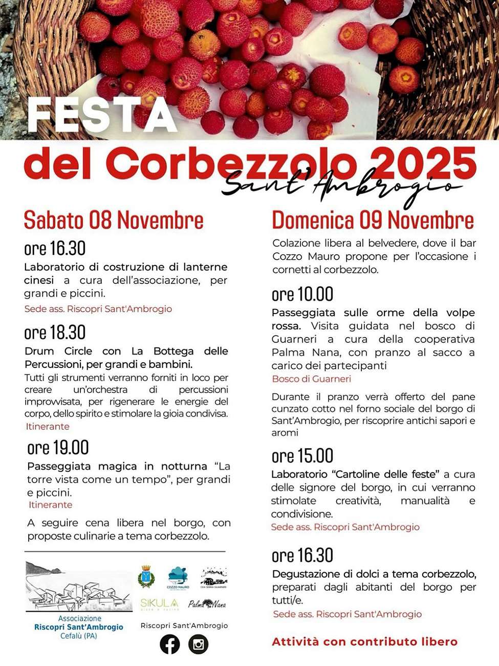 Torna anche quest’anno la Festa del Corbezzolo di Sant’Ambrogio, un appuntamento ormai immancabile per chi ama scoprire i borghi autentici della Sicilia e lasciarsi incantare dai colori e dai sapori dell’autunno. A pochi chilometri da Cefalù, Sant’Ambrogio è un piccolo gioiello incastonato tra mare e collina, dove tradizione e natura si incontrano in un equilibrio perfetto. Con le sue viuzze strette e tortuose, le case intrecciate tra cortili fioriti e una terrazza panoramica sul mar Tirreno, Sant’Ambrogio regala scorci unici e un’atmosfera sospesa nel tempo. Dall’alto, il borgo domina il golfo compreso tra gli scogli della Calura e la punta di Finale, offrendo albe e tramonti mozzafiato. Questo antico borgo di origine seicentesca, abitato da circa trecento persone chiamate “ambrosiani”, è oggi una frazione di Cefalù immersa tra colline lussureggianti e boschi rigogliosi. La sua bellezza, unita al profumo della terra e al silenzio del mare, lo rende il luogo ideale per una passeggiata rilassante o un weekend rigenerante.