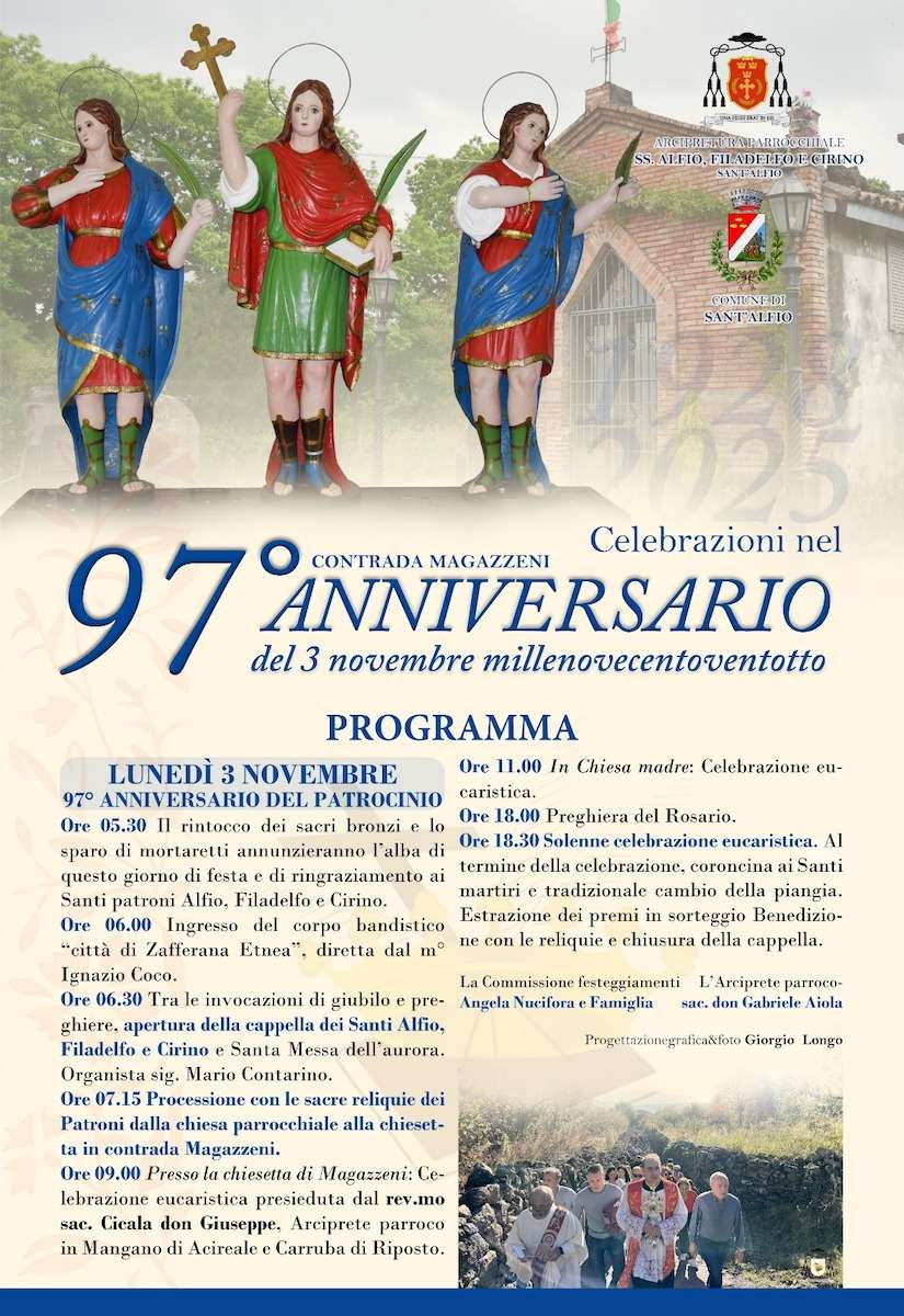Il 3 novembre di ogni anno dalla Chiesa Madre di Sant’Alfio i fedeli si recano in pellegrinaggio fino alla piccola chiesa di Magazzeni che sorge a 6 chilometri dal centro abitato. La chiesetta venne costruita nel 1958 sul luogo in cui i Santi Fratelli Martiri Alfio, Filadelfo e Cirino, il 3 Novembre 1928, fermarono la colata lavica che stava per distuggere il paese e le sue contrade. L’11 settembre si celebra l’anniversario del passaggio dei Santi fratelli martiri.