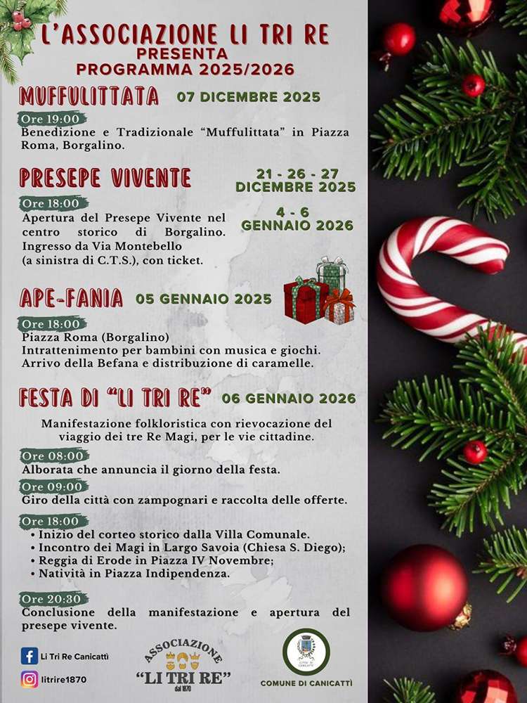 Il 6 gennaio di ogni anno a Canicattì, nell’agrigentino, si rievoca la visita dei tre Re Magi alla grotta della Natività, con una rappresentazione che ha come protagonisti Melchiorre, Baldassarre e Gaspare, impersonati dai giovani del luogo. Il centro abitato sin dalla mattina si anima con le note degli zampognari che sfilano per le vie del paese dando inizio alla festa le cui origini risalgono all’Ottocento, quando un tal Luigi Antinoro, maniscalco canicattinese, stimolato da una raffigurazione dell’adorazione dei tre Re, ebbe l’idea di creare una grande festa per celebrare i Magi. Correva l’anno 1872 e a Canicattì andò in scena la festa dei Tre Re con la rappresentazione della Natività ospitata all’interno di una grotta sopra un palco dinanzi alla chiesa di Santo Spirito. Il pomeriggio dell’Epifania i re Magi sui loro cavalli, muovendosi da tre punti diversi del centro abitato, raggiungevano Piazza Roma nel quartiere Borgalino. Due di loro portavano una corona di carta dorata e avevano addosso maglie a strisce multicolori e la veste liturgica a forma di grande mantello che i sacerdoti indossano nelle sacre funzioni. La rappresentazione era preceduta la mattina dal giro dei “ciaramiddara”, che con il suono delle ciaramelle annunciavano il giorno di festa e culminava nel pomeriggio davanti alla chiesa dove si svolgeva una sacra recita conclusa dal sermone del padre guardiano del convento.