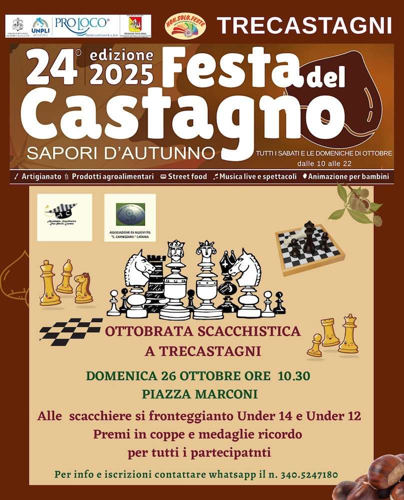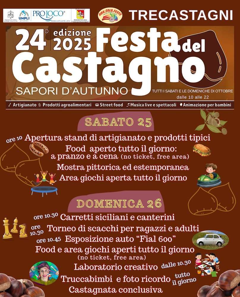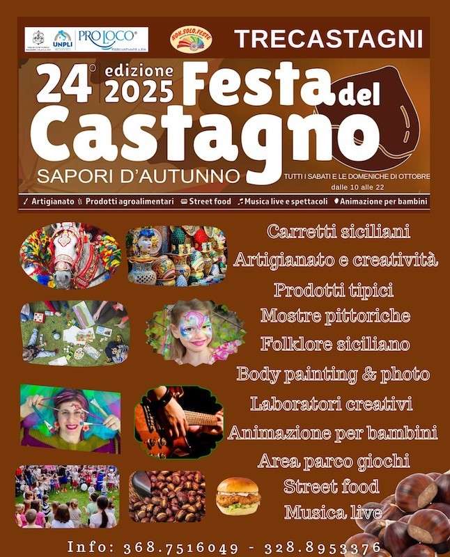 A Trecastagni si celebrano i profumi e i sapori dell’Autunno. La Festa del Castagno si svolgerà tutti i fine settimana del mese di ottobre con gli stand artigianali e dei prodotti tipici, la passeggiata sul carretto siciliano, laboratori e animazione per i più piccoli e visite guidate alle bellezze architettoniche del paese. Il paese di Trecastagni fa parte del Parco dell’Etna e il suo territorio si caratterizza per la presenza di boschi di castagni, querce e lecci. Con il legname di castagno le imprese locali producono manufatti per uso abitativo mentre invece dal frutto prelibato viene ricavata tra l’altro la farina, utilizzata nella preparazione di numerose ricette.
