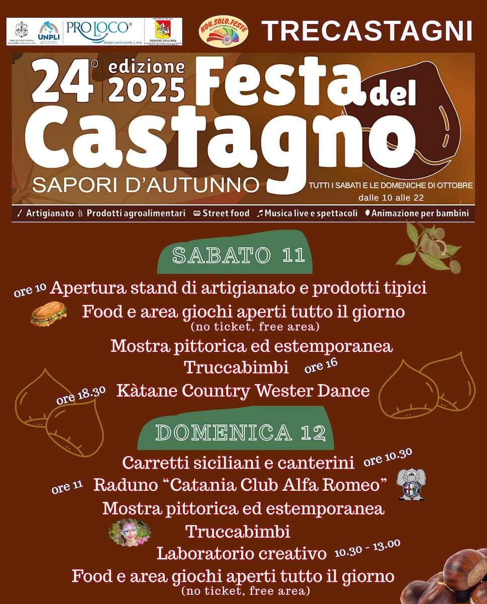 Durante la manifestazione Festa del Castagno di Trecastagni si celebrano le tipicità del territorio e si potranno degustare le specialità della gastronomia siciliana, i sapori e i profumi dei prodotti di stagione, castagne e vino. Vi saranno artigiani, hobbisti, artisti e creativi, musica live e spettacoli. La Festa del Castagno di Trecastagni è in programma in Piazza Marconi tutti i sabati e le domeniche di ottobre, dalle 10 alle 22.