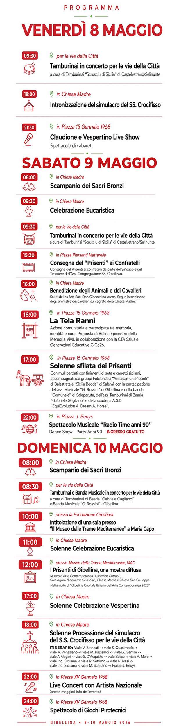 A Gibellina, nel mese di maggio, si celebra il SS. Crocifisso con una festa molto sentita dalla popolazione locale e dai fedeli che giungono numerosi anche dai paesi vicini e vi prendono parte con particolare devozione. La storia della festa per il SS. Crocifisso di Gibellina ha origini remote ed è legata ad un’antica leggenda che narra del ritrovamento di un Crocifisso ligneo avvenuto nel XVI secolo nelle campagne tra Gibellina e Santa Ninfa, che poi fu trasportato nel cimitero dell’antica Gibellina. All’epoca risale anche la nascita della Congregazione del Santissimo Crocifisso, costituita dai più benestanti proprietari terrieri, i burgisi, che ogni anno si occupavano di organizzare le celebrazioni religiose in onore del Santissimo Crocifisso, attraverso le questue e la raccolta delle offerte votive.