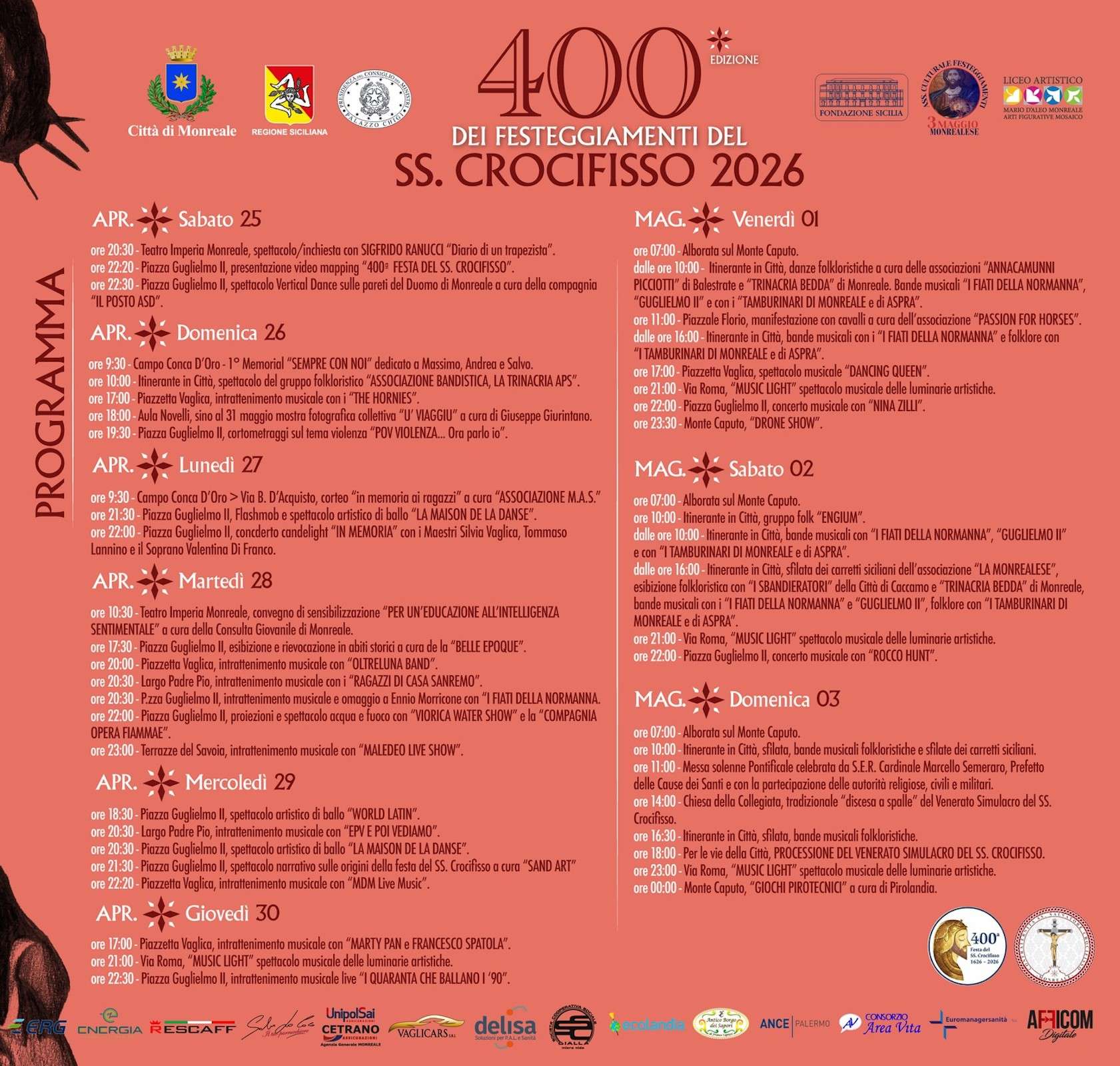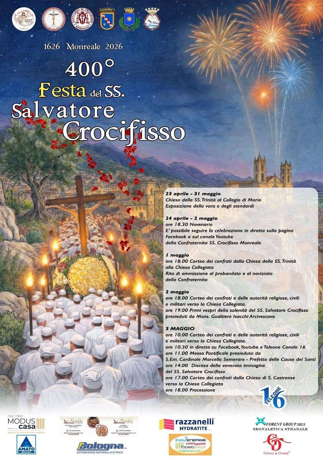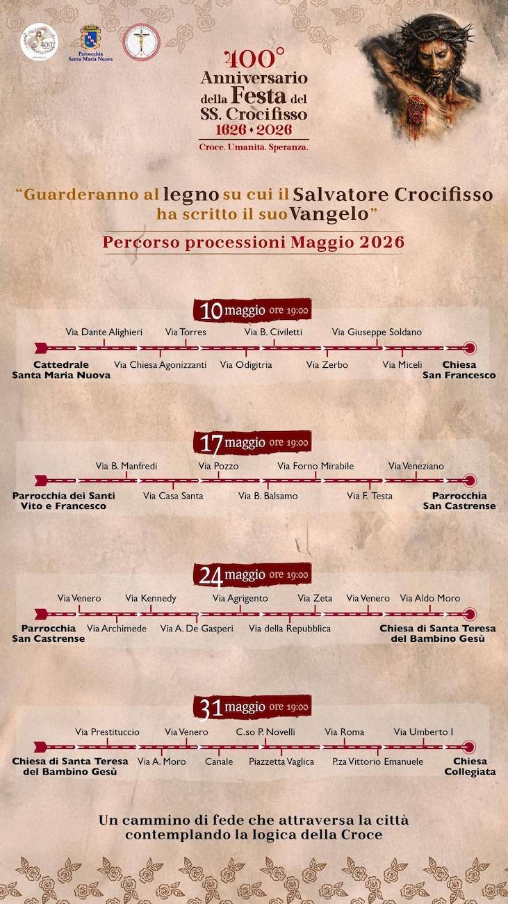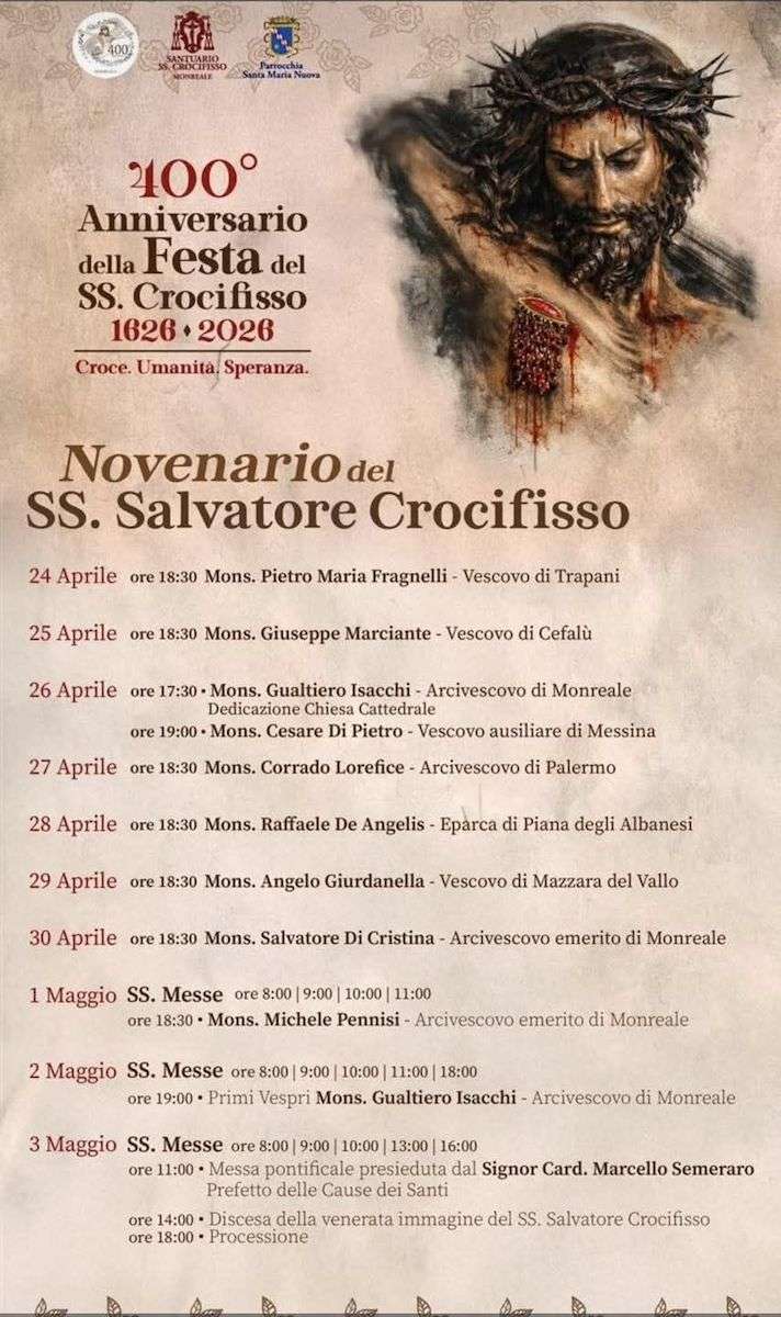 Festa SS. Crocifisso 2026 Monreale: Quest’anno Monreale celebra un traguardo storico: la 400ª edizione dei festeggiamenti in onore del Santissimo Crocifisso. Un appuntamento unico e carico di significato, che segna quattro secoli di devozione, tradizione e identità condivisa. Per l’occasione, la città si prepara a vivere un evento senza precedenti, con un programma straordinario che, dal 25 aprile al 3 maggio 2026, renderà omaggio al profondo e indissolubile legame tra la comunità monrealese e il suo simbolo più sacro.