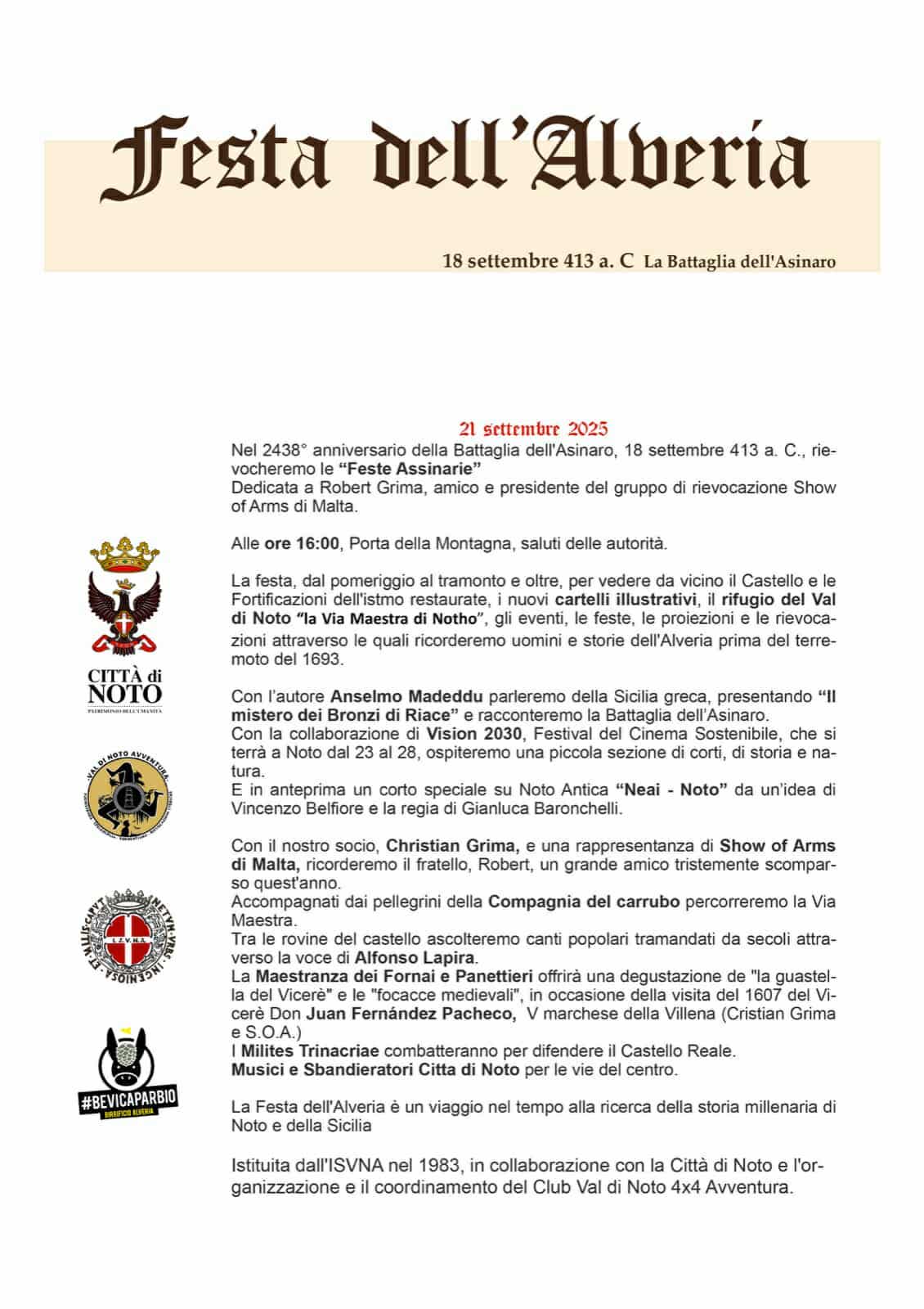 La Festa dell’Alveria di Noto torna quest’anno con un’edizione speciale che si intreccia alle Feste Assinarie, nel segno del 2438° anniversario della Battaglia dell’Asinaro (18 settembre 413 a.C.). L’evento sarà dedicato a Robert Grima, presidente del gruppo di rievocazione Show of Arms di Malta, recentemente scomparso. Un omaggio sentito che diventa occasione per vivere un programma ricco di eventi, tra rievocazioni storiche, proiezioni, spettacoli e momenti di festa che riporteranno in vita le storie e le atmosfere dell’antica Alveria, prima del devastante terremoto del 1693. Il pubblico potrà compiere un viaggio nella Sicilia greca con Anselmo Madeddu, passando dalla celebre Battaglia dell’Asinaro al mistero che avvolge i Bronzi di Riace. Grazie alla collaborazione con Vision 2030 – Festival del Cinema Sostenibile, che si terrà a Noto dal 23 al 28 settembre, sarà inoltre presentata una sezione di cortometraggi dedicati a storia e natura, insieme a un’anteprima speciale: il corto su Noto Antica firmato da Vincenzo Belfiore e Gianluca Baronchelli. Non mancheranno momenti di grande suggestione: la seconda edizione dell’Oplitodromia, i canti popolari tra le rovine del castello, le degustazioni della Maestranza dei Fornai e Panettieri con la tradizionale “guastella del Vicerè” e le “focacce medievali” e lo spettacolo dei Milites Trinacriae, che con i loro duelli scenici faranno rivivere la forza e l’epicità di un tempo lontano, difendendo simbolicamente le mura del Castello Reale.