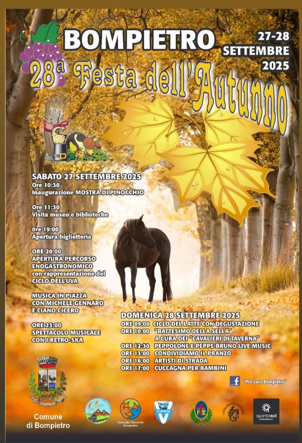 La festa dell’Autunno di Bompietro, organizzata dalla Pro Loco, ha numerosi appuntamenti in programma, quali la tradizionale rievocazione di usi e consuetudini legate ai cicli dell’uva e del latte, la degustazione di prodotti tipici locali, esibizioni folkloristiche, musica e balli in piazza. Negli stand allestiti in occasione della Festa d’Autunno a Bompietro si potranno degustare varie specialità, dai ceci al panino con la salsiccia, dai formaggi al vino, ma anche miele, mozzarella di bufala, salumi e frutta di stagione.