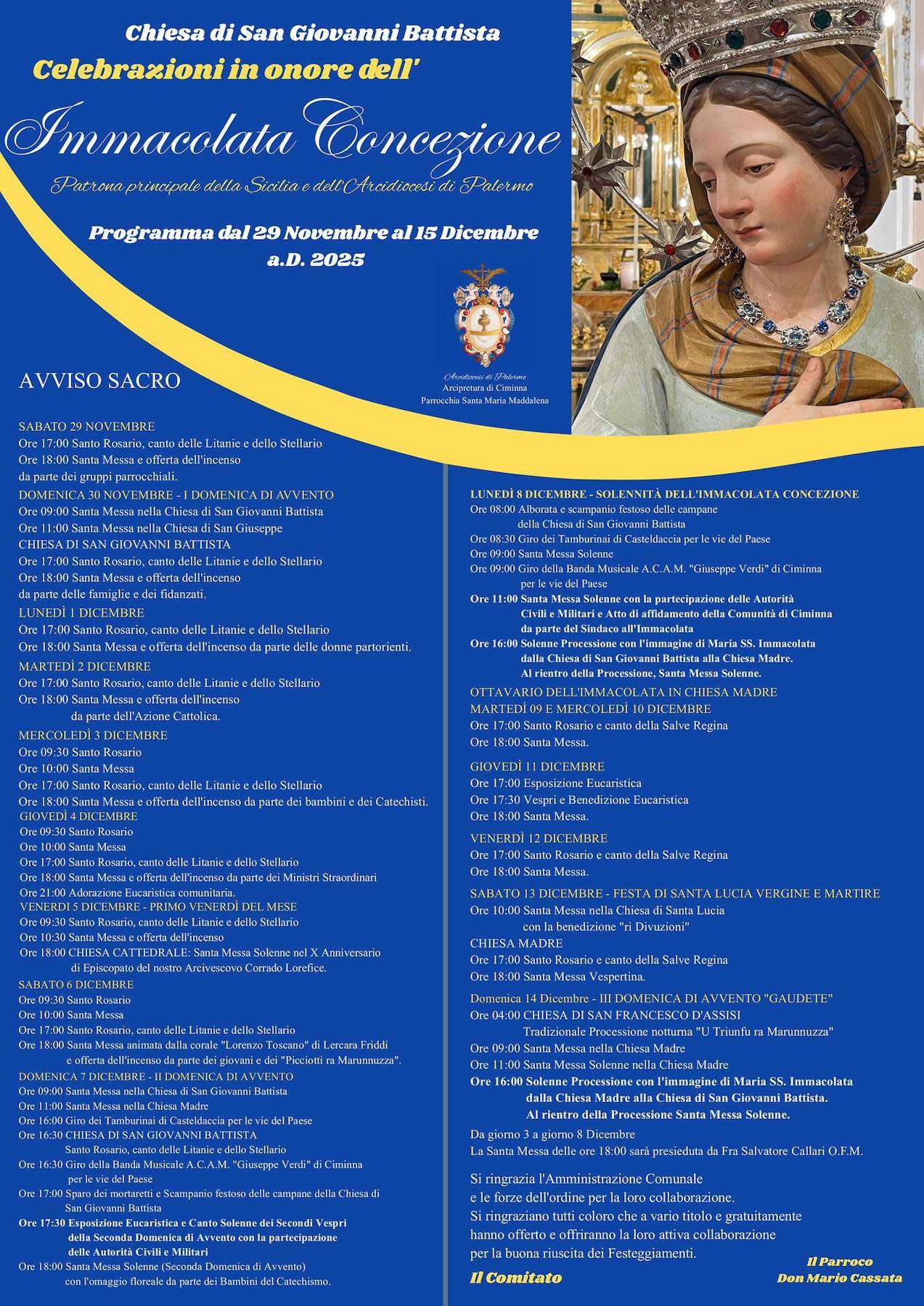 N.B. Festa dell’Immacolata 2025: a causa dei lavori all’interno della Chiesa di San Francesco d’Assisi, quest’anno, la festa dell’Immacolata Concezione si svolgerà nella Chiesa di San Giovanni Battista.