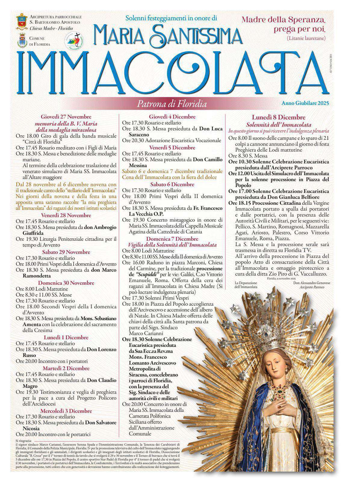 La Festa dell’Immacolata a Floridia, la tradizionale processione de I Scupiddi della vigilia, la Messa Solenne e la processione del Simulacro portato a spalla per le vie cittadine. La festa dell’Ascensione e il Patrocinio di Maria SS. Immacolata su Floridia.