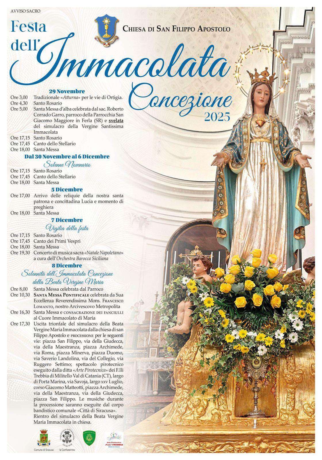 L’Immacolata veniva celebrata anche dalle suore del monastero di S. Maria presso la chiesa sotto il titolo dell’Immacolata Concezione, e fin dal 1740 alle funzioni religiose prendeva parte il Senato cittadino che giurava fedeltà all’Immacolata. Fu così deciso di celebrare la festa in ambedue le chiese. Ancora oggi, il rito della svelata si ripete nella Chiesa di San Filippo alla Giudecca e i devoti della Confraternita dell’Immacolata, il giorno di festa, portano a spalla il bel simulacro della Madonna per le vie del centro storico di Siracusa.