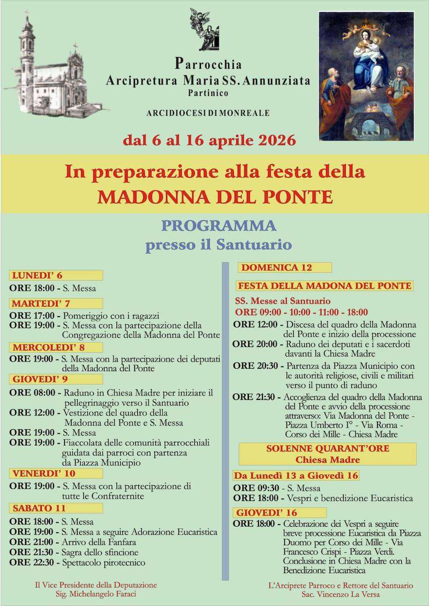 La Festa di Maria Santissima del Ponte di Partinico comincia il Lunedì di Pasqua e dura diversi giorni, durante i quali al santuario si svolgono preghiere, messe, lodi, vespri, adorazioni e pellegrinaggi. Il giovedì che precede il giorno solenne, di buon mattino inizia il pellegrinaggio dei fedeli verso il santuario dove avverrà la vestizione del Quadro, con la veste e gli ornamenti che i partinicesi realizzarono a proprie spese, per devozione alla Madonna, come ornamento della Sacra immagine, quali la veste, la corona, i diademi dei santi laterali Pietro e Giovanni e loro geroglifici, come il ponte, chiavi, calice e il lampiere, tutti di argento.