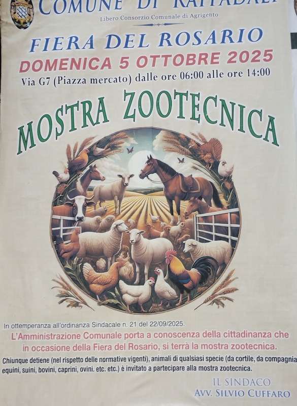 La festa di Raffadali è nota anche come Fiera del Rosario poiché viene allestito il tradizionale mercato legato all’allevamento e all’agricoltura e ha luogo la mostra di zootecnia con gli animali da cortile, da compagnia, equini, suini, ovini, caprini ecc. Saranno giorni di festa che si divideranno tra funzioni religiose e momenti di svago con le esibizioni di gruppi folkloristici e le degustazioni dei prodotti tipici locali, tra cui ‘u maccu di fave, originario proprio di Raffadali che non a caso è conosciuto come “u paisi du maccu”.