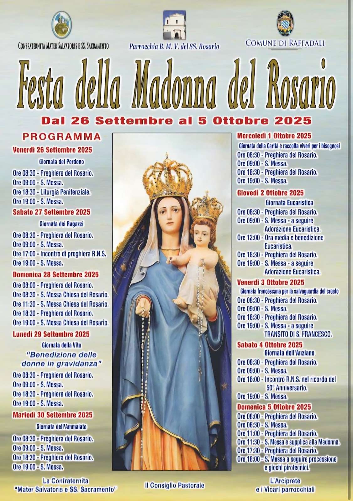 La Festa della Madonna del Rosario a Raffadali è di antica tradizione ed molto sentita dalla comunità locale. Il culto è diffuso in tutto l’agrigentino e sono molti i paesi della provincia in cui si celebra la Madonna del Rosario. I festeggiamenti per la Madonna del Rosario a Raffadali sono preceduti dalla novena e culminano la prima domenica di ottobre con la suggestiva processione all’imbrunire e i giochi pirotecnici in piazza. Il pomeriggio della domenica della festa del Rosario a Raffadali, al termine della celebrazione della Santa Messa, il pregevole simulacro viene condotto fuori dalla Chiesa del Rosario e prende inizio la solenne processione che percorrerà le vie del centro e a cui partecipano fedeli e devoti anche dei paesi vicini.
