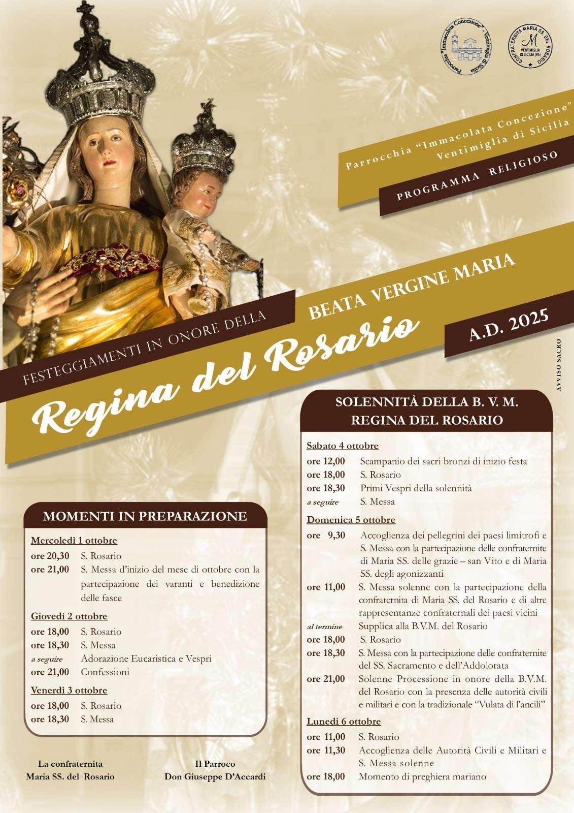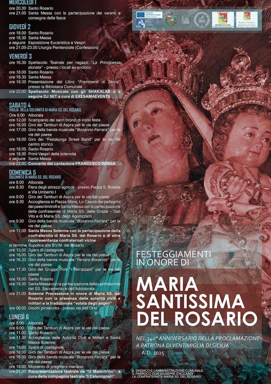 La Madonna del Rosario a Ventimiglia di Sicilia viene celebrata la prima domenica di ottobre in quella che è la festa patronale del paese. Maria SS. Regina del Rosario è stata eletta Patrona di Ventimiglia di Sicilia nel 1785 e da allora viene celebrata con solenni celebrazioni che si protraggono per diversi giorni e che vedono la partecipazione di tutta la comunità.