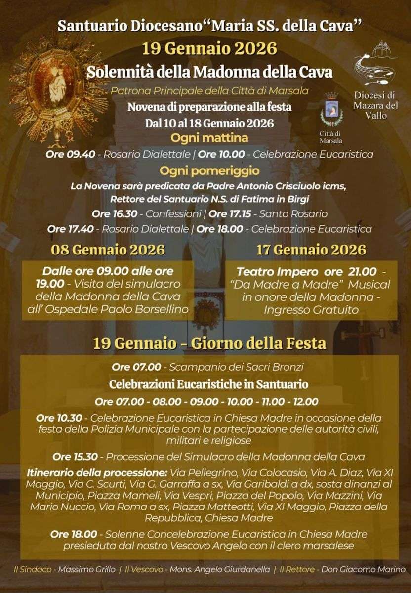 Il 19 gennaio Marsala celebra la Madonna della Cava, eletta Patrona della Città il 6 maggio del 1788. La devozione per la Madonna della Cava risale a qualche tempo prima, e precisamente agli inizi del XVI secolo quando, all’interno di un pozzo, fu ritrovato un simulacro della Madonna, nascosto lì da alcuni fedeli lilibetani al tempo della persecuzione dell’imperatore Bizantino Leone III Isaurico che, nel 726, emanò una serie di editti volti ad eliminare il culto delle immagini sacre.