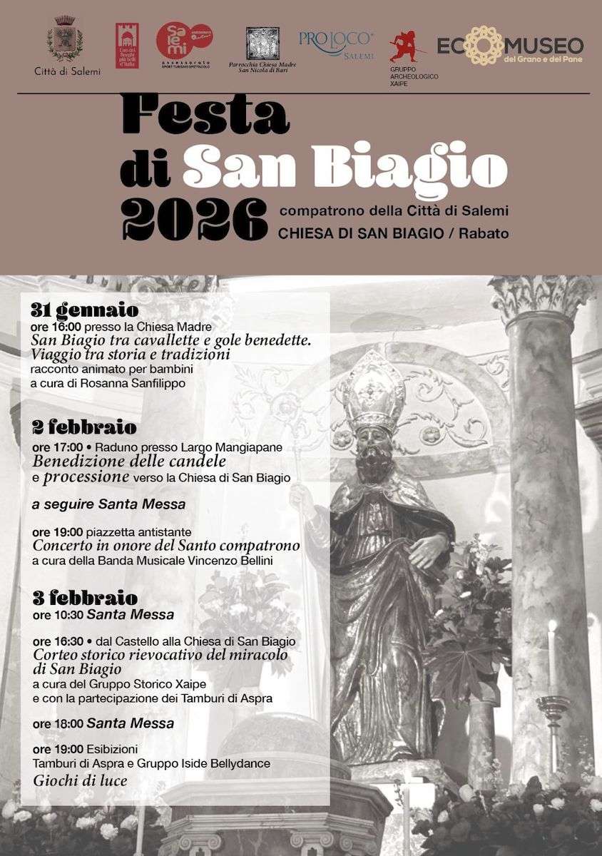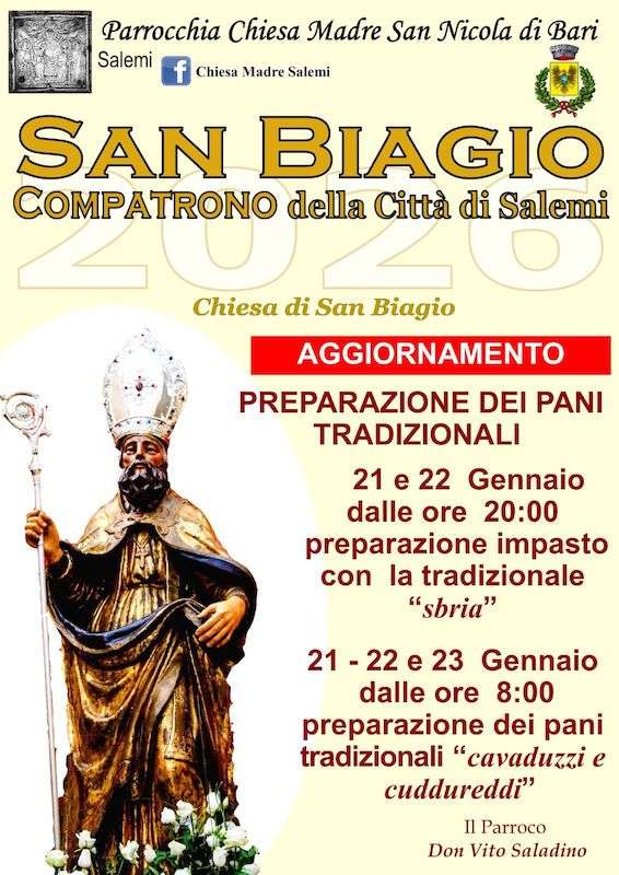 La Festa di San Biagio di Salemi è molto sentita da tutta la comunità che con grande devozione si prepara all’evento in anticipo. Circa un mese prima della Festa di San Biagio a Salemi, le donne del quartiere arabo denominato “Rabato” iniziano la lavorazione dei caratteristici pani, che verranno benedetti durante la Messa e donati ai fedeli nel giorno dedicato a San Biagio.