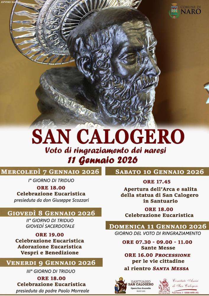Il paese di Naro il 18 giugno celebra il Santo Patrono con una suggestiva festa alla quale prendono parte numerosi fedeli provenienti anche dai paesi vicini. Il culto di San Calogero Eremita a Naro ha origini molto antiche e viene rivendicato da molte città siciliane. Al Santo infatti si deve la fine della peste che colpì la città agrigentina nel 1626. Due anni prima infatti Suor Serafina Maria Pulcella, terziaria francescana, ebbe in visione il Santo, il quale le diceva che, per sua intercessione, il terribile morbo avrebbe avuto fine. La città di Naro scelse così come Patrono e protettore San Calogero, al posto della sua antica Patrona, Santa Caterina d’Alessandria. Ma si narra anche che nel 1693 l’Eremita abbia protetto Naro da un terribile terremoto.