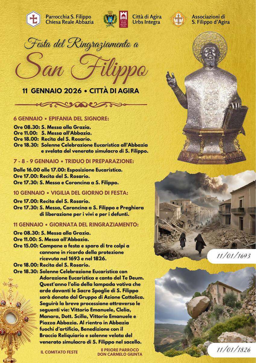 Il momento più suggestivo della Festa di San Filippo d’Agira è la processione che si svolge la sera del 12 maggio, dopo la celebrazione della Santa Messa, quando la statua e il braccio reliquiario del Santo vengono portati a spalla dai devoti a piedi scalzi sino all’Abbazia. Al termine della processione i fedeli si riuniscono nell’Abbazia di San Filippo per il consueto bacio alla reliquia benedetta. La tradizione vuole che nel IV secolo d.C. il taumaturgo siriaco Filippo dopo essere stato ordinato sacerdote, sia stato inviato dal Papa ad Agira per evangelizzare la popolazione. Si narra anche che il Santo fu seppellito all’interno di una grotta dove era solito celebrare i sacramenti. Ed infatti i resti di “San Fulippuzzu”, come viene chiamato dai fedeli, furono trovati nella cateva sotto la chiesa dell’Abbazia. Della Festa di San Filippo d’Agira hanno parlato diversi storici, tra cui Tommaso Fazello, che nel XVI secolo scrisse di avere assistito a centinaia di miracoli ad opera del Santo, avvenuti in un solo giorno.