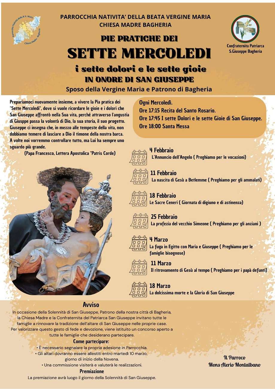 A Bagheria la devozione per San Giuseppe è molto sentita dalla popolazione che ha elevato il Patriarca a Patrono della città nel lontano 1658. La festa di San Giuseppe di Bagheria si svolge il 19 marzo di ogni anno e viene preceduta dalla novena, dalla tradizionale benedizione del pane e dalla Sagra della sfincia, la specialità dolciaria preparata in occasione della festa, organizzata dalla confraternita del Patriarca San Giuseppe. Il culto di San Giuseppe a Bagheria fu introdotto dal Principe Giuseppe Branciforti all’epoca della fondazione del paese. Al nobile si deve la realizzazione di una piccola cappella consacrata alla Natività della Beata Vergine Maria, al cui interno vi era un dipinto del Patriarca. Il pregevole simulacro di San Giuseppe raffigurato con in braccio il Bambin Gesù, custodito in uno degli altari laterali della Chiesa Madre, fu realizzato dallo scultore Filippo Quattrocchi il secolo successivo.