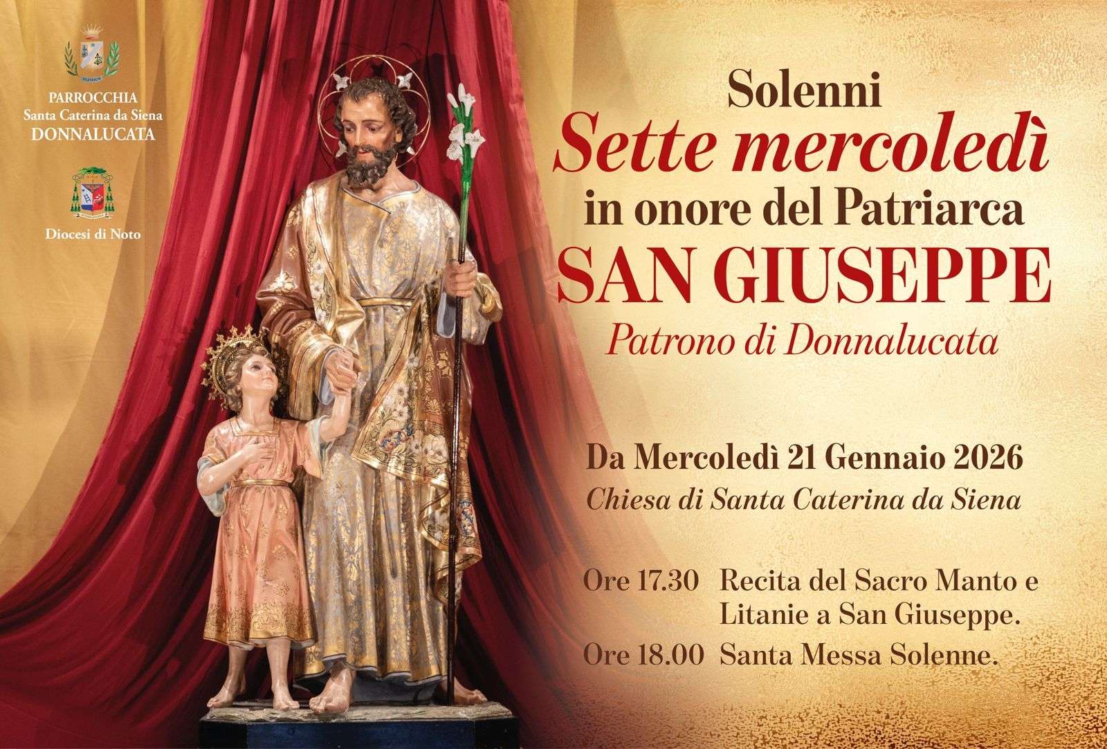 La Festa patronale a Donnalucata culmina la domenica quando il simulacro del Santo Patrono dalla chiesa di San Giorgio viene portato assieme al tradizionale Stendardo di colore azzurro e verde, sul sagrato della Chiesa di Santa Caterina da Siena per i festeggiamenti che prevedono la sfilata dei carretti siciliani e dei cavalli bardati e nel pomeriggio la celebrazione della Messa Solenne e la processione di San Giuseppe per le vie della borgata marinara. Le celebrazioni si concluderanno solo in serata con la Cena di San Giuseppe e la vendita all’incanto dei doni offerti dai devoti.