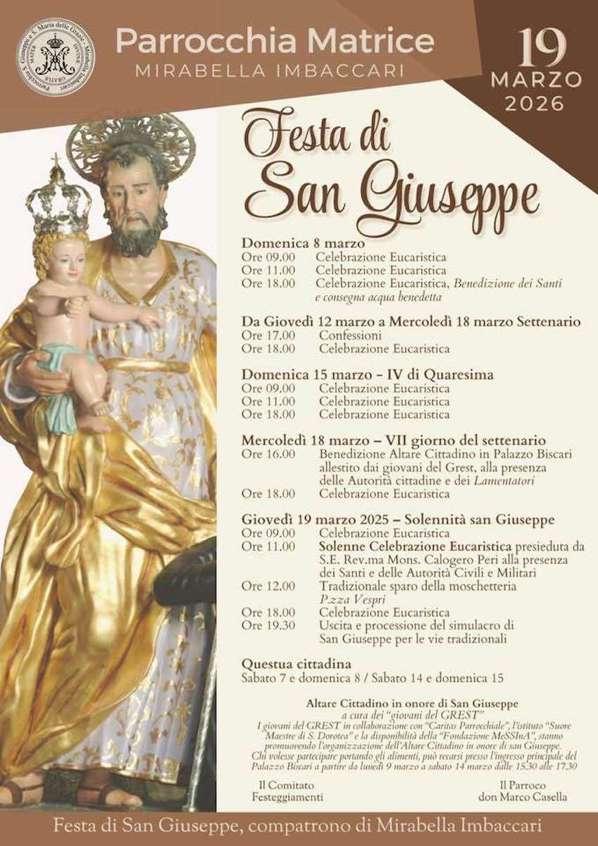 La festa di San Giuseppe è una delle poche tradizioni che a Mirabella Imbaccari sono rimaste nel tempo e ogni anno si rinnova coinvolgendo tutta la comunità. La festa di San Giuseppe di Mirabella Imbaccari è difatti tra le più belle e caratteristiche del calatino ed è legata all’allestimento di quelli che qui chiamano Autari di San Giuseppe, delle vere e proprie opere d’arte a cui si lavora da giorni. Il grande tavolo viene sistemato ad altare, ricoperto di lenzuola bianche ricamate e adornato con fiori, arance, alloro, immagini di santi e naturalmente l’icona della Sacra Famiglia che per tradizione sarà pure interpretata da tre personaggi, scelti fra le persone più bisognose del paese. I “Tre Santi” il giorno solenne siederanno attorno al tavolo per consumare il pranzo. A San Giuseppe a Mirabella Imbaccari è consacrata la Chiesa di Maria SS. delle Grazie. San Giuseppe è patrono di Mirabella Imbaccari assieme alla Madonna delle Grazie.