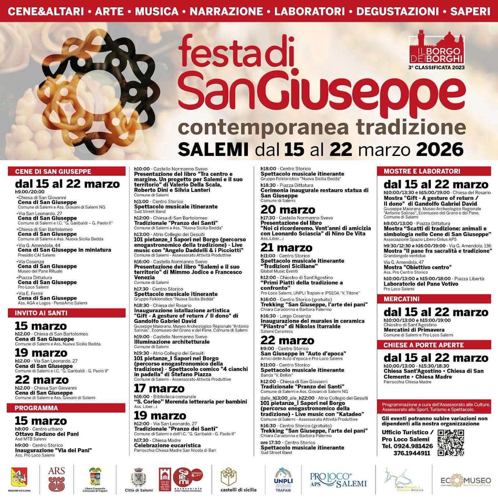 In occasione della Festa di San Giuseppe a Salemi, i veri protagonisti saranno i suggestivi altari di pane, le tradizionali Cene di San Giuseppe, i laboratori artigianali e il fascino del centro storico, riconosciuto tra i Borghi più belli d’Italia.