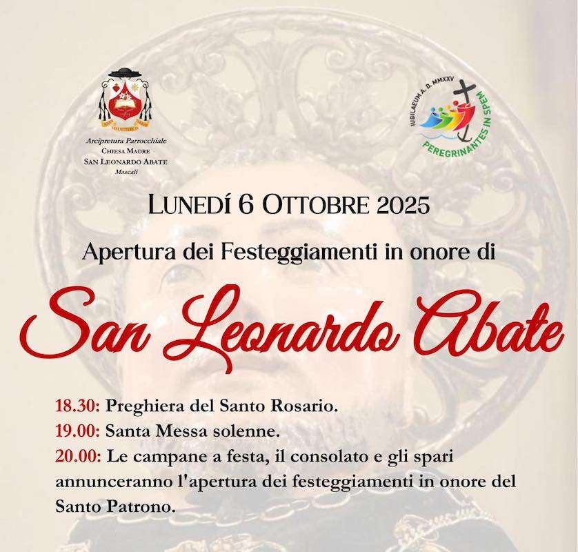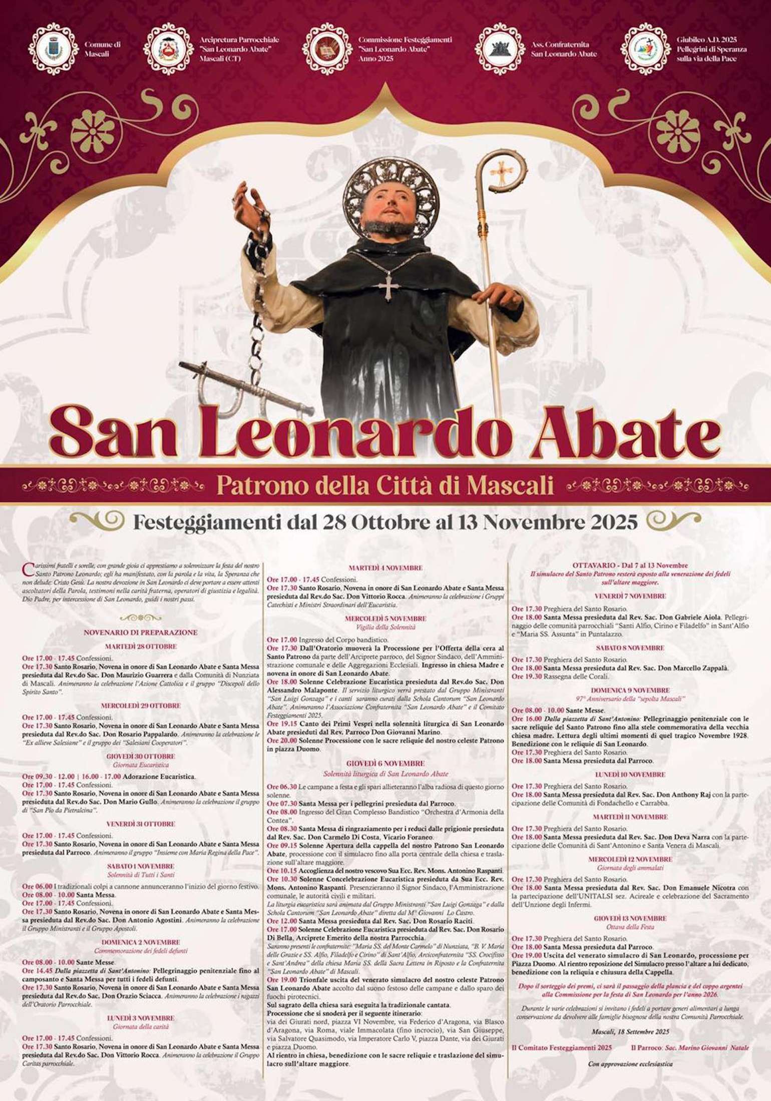 La Festa di San Leonardo Abate di Mascali, il solenne novenario, la visita del Braccio Reliquiario alle famiglie, l’apertura dei festeggiamenti, la solennità liturgica, l’apertura della cappella del Santo Patrono, la Santa Messa solenne e la processione del simulacro per le vie della città. La Fiera di San Leonardo di Mascali.