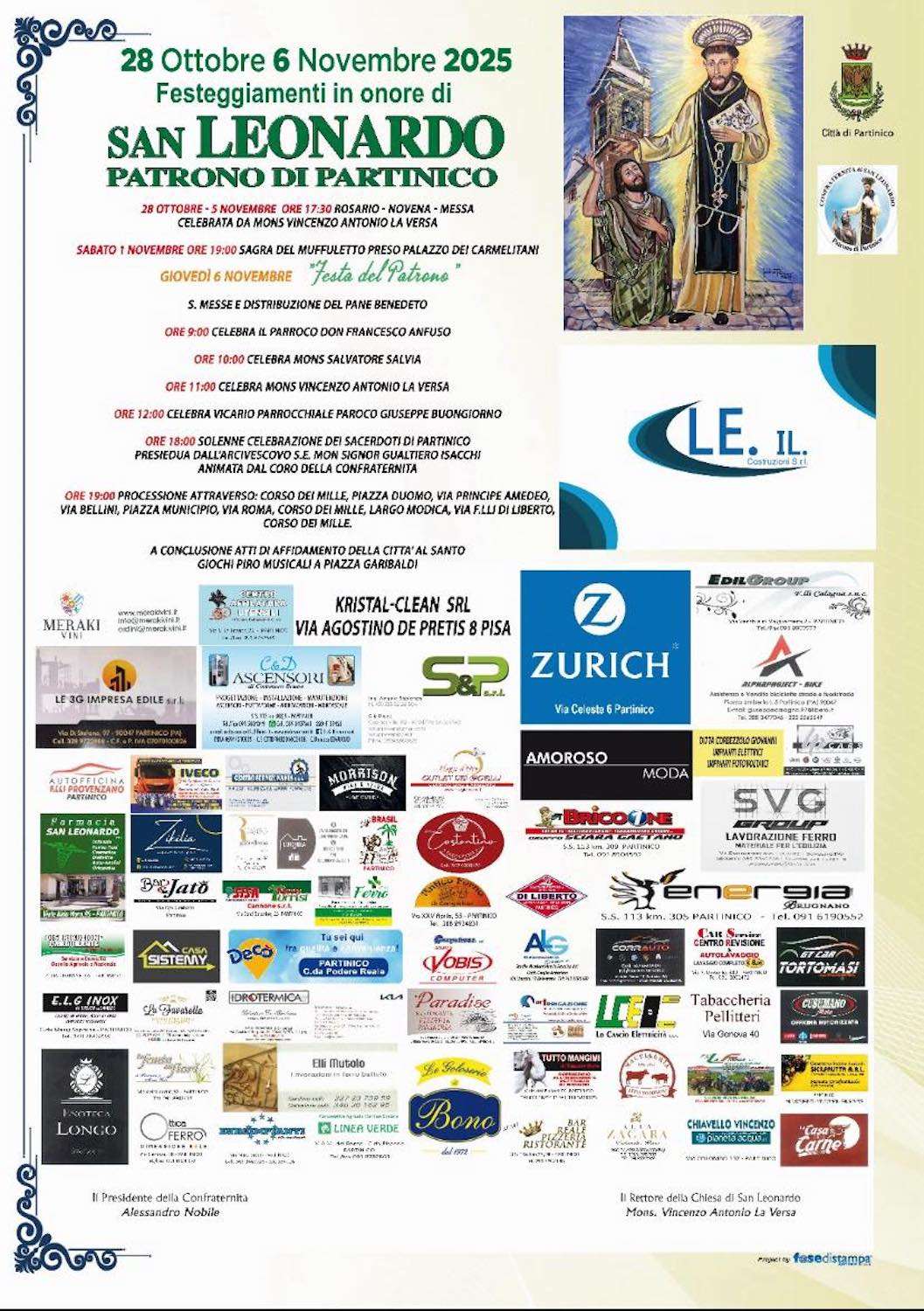 Il 6 novembre a Partinico si svolge la festa in onore a San Leonardo Patrono della città sin dai tempi della sua fondazione. Nel manoscritto sulla “Storia di Partinico” del 1805, il notaio Giuseppe Maria di Bartolomeo, storico e intellettuale del luogo, narra che il Santo, nato in Gallia al tempo dell’imperatore Anastasio e morto il 6 novembre del 559 circa, fu prescelto come patrono del paese, poiché «monaco dell’ordine cistercense in Francia e perché in questo luogo appunto, ove sorse poi l’abitato, si volle per costante tradizione esservi stata una parte del bosco di Partinico appellata di San Leonardo». Al patrono fu anche dedicata la Chiesa della Compagnia del Santissimo Sacramento, nella quale «si convoca, nelle contingenze, il civico consiglio, in essa si sollenizza il 6 novembre la festa del santo patrono, lo stesso giorno, dopo pranzo, s’impone dai vocali soliti la meta delle uve e si porta processionalmente per la città il simulacro del Santo preceduto dalle Compagnie, regolari e clero, giusta la provvista ottenutane i confrati nel loro mandato o dispaccio della cancelleria di Mazzara li 20 maggio, 9 ind., 1671».
