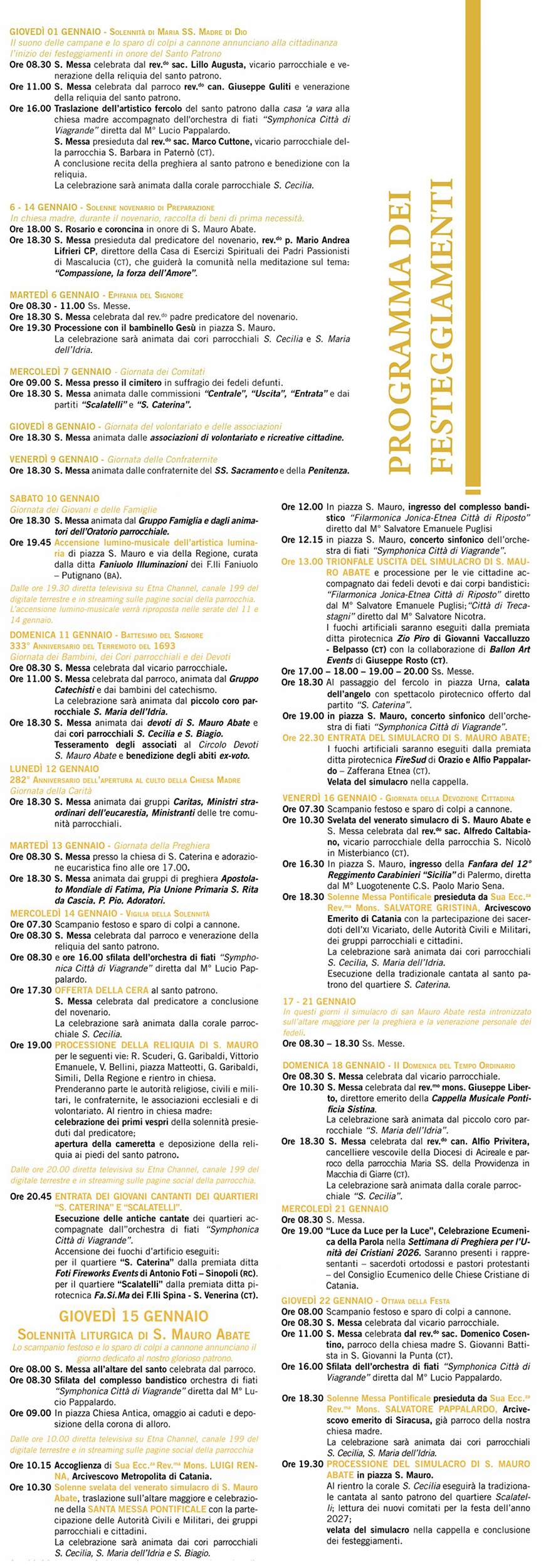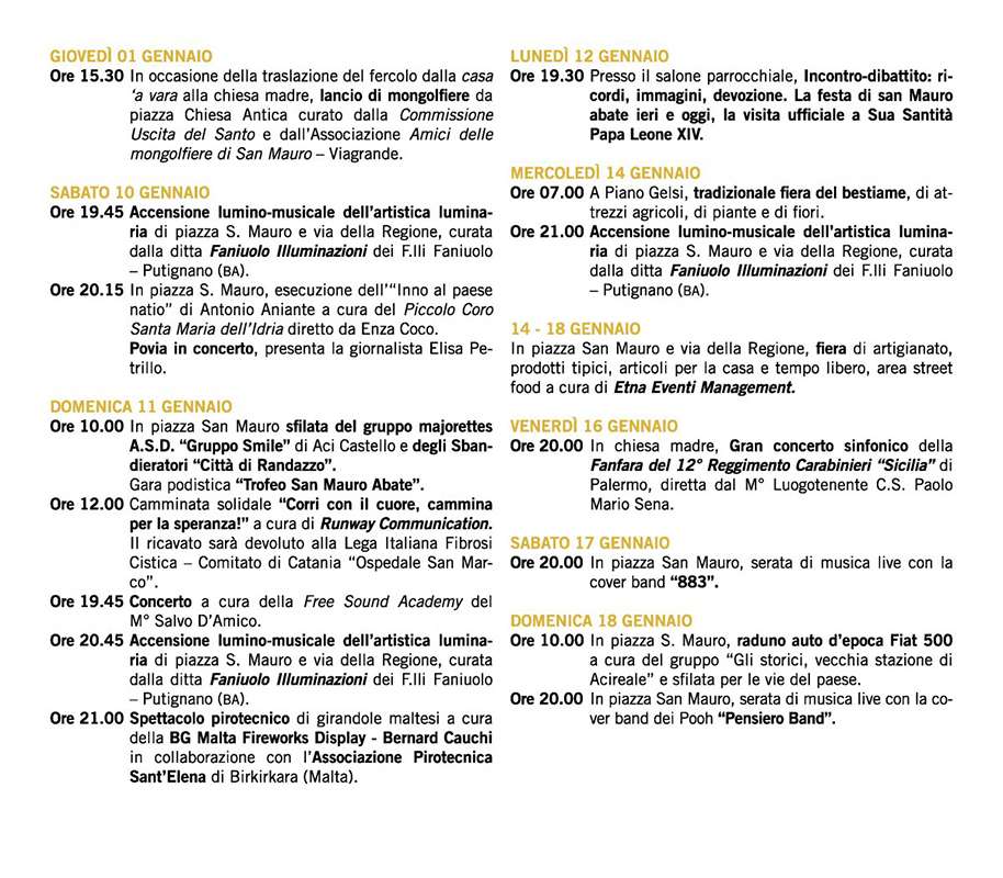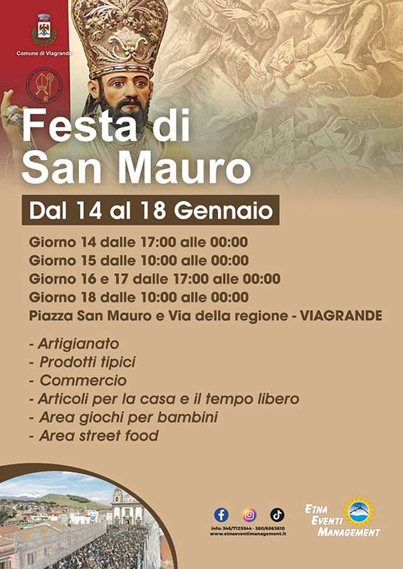 Le celebrazioni in onore di San Mauro a Viagrande cominciano il primo giorno del mese di gennaio quando la mattina presto il suono delle campane e lo sparo di colpi a cannone annunciano alla cittadinanza l’inizio dei festeggiamenti, e proseguono nel pomeriggio con la traslazione del fercolo di San Mauro Abate dalla “Casa ‘a vara” alla Chiesa Madre, accompagnato dai Comitati e dalla banda musicale. Il 14 gennaio, vigilia della festa, viene allestita una grande fiera del bestiame e degli attrezzi agricoli, una delle poche rassegne di questo genere, che ancora oggi si svolgono in provincia di Catania. Sul far della sera il braccio reliquiario di San Mauro Abate viene portato in processione per le vie del paese accompagnato dalle Autorità Religiose, Civili e Militari, dalla Confraternite e da numerosi fedeli per poi fare rientro in Chiesa Madre per essere posto ai piedi del Santo Patrono. Subito dopo faranno il loro ingresso in chiesa i giovani cantanti dei quartieri Scalatelli e S. Caterina che si esibiranno in antiche cantate, mentre i cittadini dei due quartieri si sfideranno in una spettacolare gara di giochi pirotecnici.